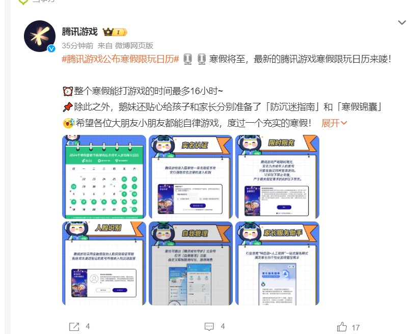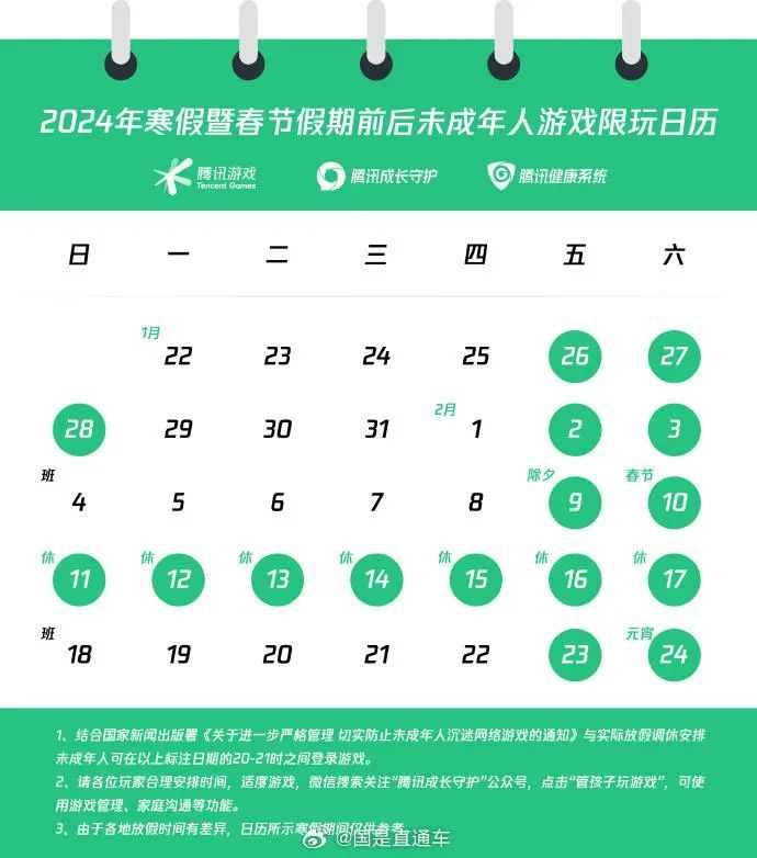 9日,腾讯游戏发布“2024年寒假暨春节假期未成年人游戏限玩通知”。话题 #腾讯游戏公布寒假限玩日历#迅速登上热搜,引发热议。