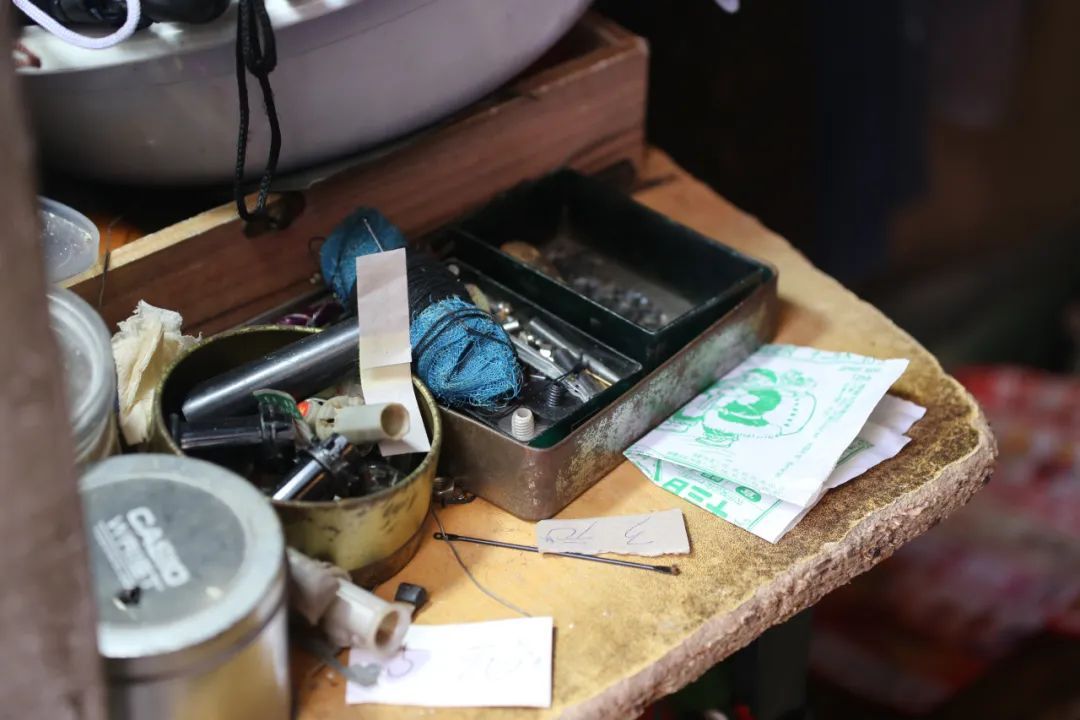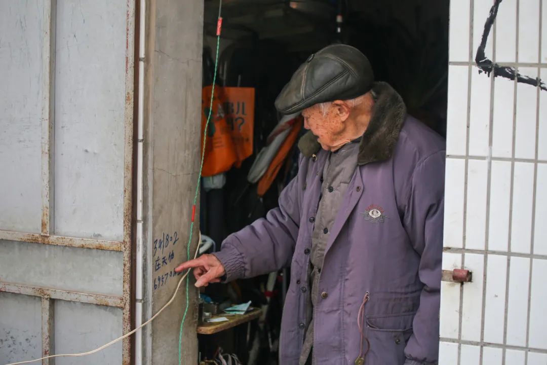 “粥吃好了就放在床头柜,开水壶在床下,我大概十点多回来。”清晨五点半,庄天佑向躺在床上的老伴交代好行程,便轻轻带上房门,跨上自行车,朝离家百米外的修伞铺出发。这段路程他已经走了30余年,此时夜色尚未褪去,气温寒冷。他取下店门门锁,把修伞工具取出罗列在脚边,搬出小板凳,开始仔细检查昨天客人的修理委托。尚无行人的街道上,一盏小小的白炽灯亮起,修伞铺今日营业开始。