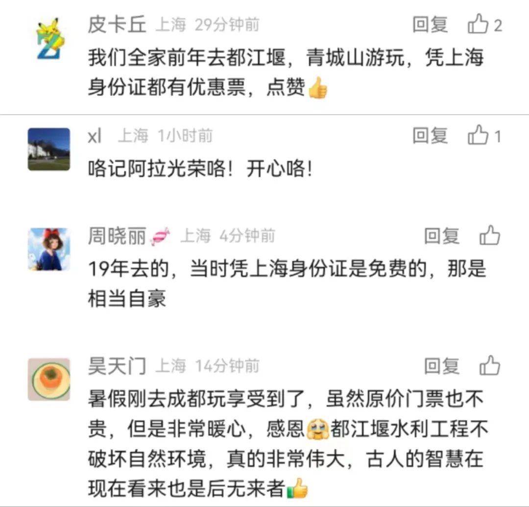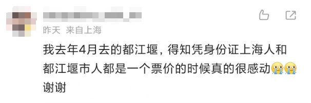 据了解,四川多地的景区,都对灾后重建对口支援省市游客有优惠措施,且实施多年。除了都江堰、青城山景区对上海游客有优惠外,还有四川剑阁的剑门关、翠云廊景区对黑龙江省游客免门票,因灾后重建时是黑龙江省支援剑阁;四川青川的唐家河景区对浙江省游客免票,因浙江正是青川县的对口支援省份。