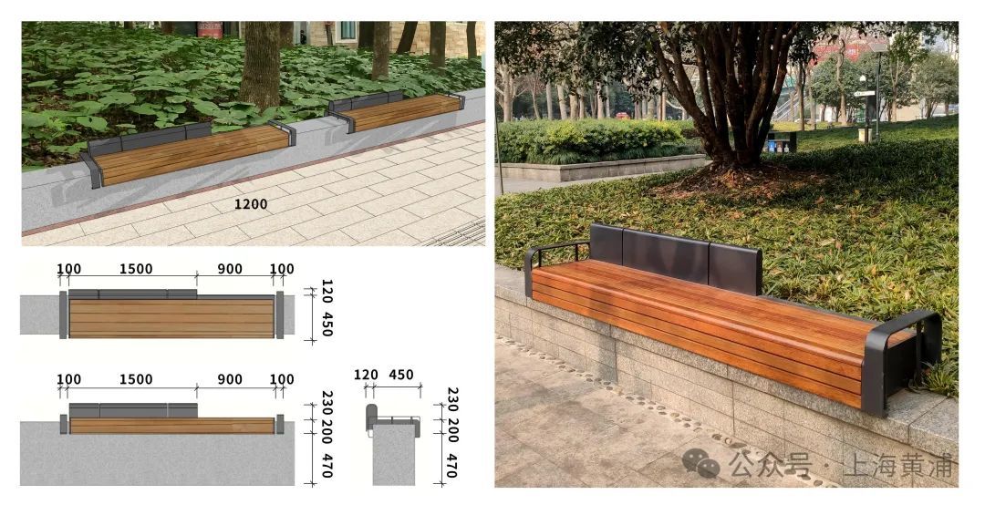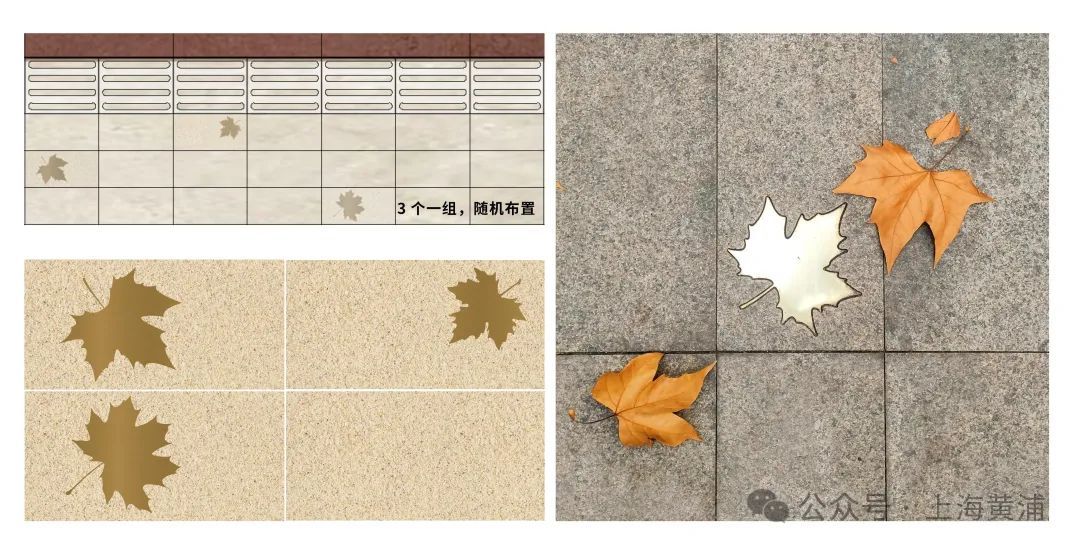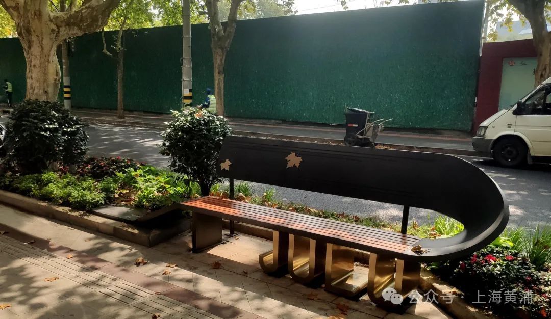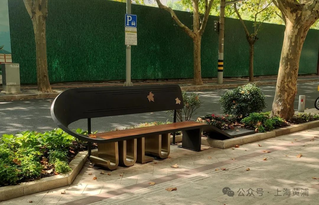 地雕选取街区最标致的梧桐叶为素材,结合座椅、电话亭、邮筒休憩座椅位置成组设置;选择在道路空间相对宽阔、光线舒适、具备人行停留需求的位置,集中设置多处休憩座椅。依托绿地花坛,面层使用防腐木以保证使用的舒适性,并设置了深灰色扶手与圆拱形矮靠背。