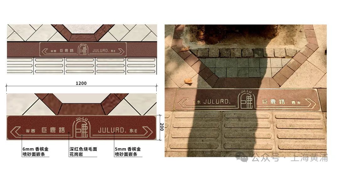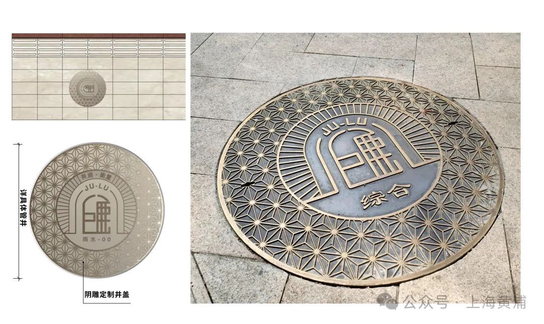 同时,在路口位置,结合树池设置导视铺装,图形以巨鹿路文化符号为核心,增加东西方向标注,嵌入香槟金色不锈钢嵌条;并在沿线两端和中段设置艺术井盖,其中心设置巨鹿路特色文化符号,周边结合玻璃的冰花纹理和砖墙纹理,增加摩擦以提高安全性,采用黄铜色材质与道路铺装和整体道路风貌相协调。