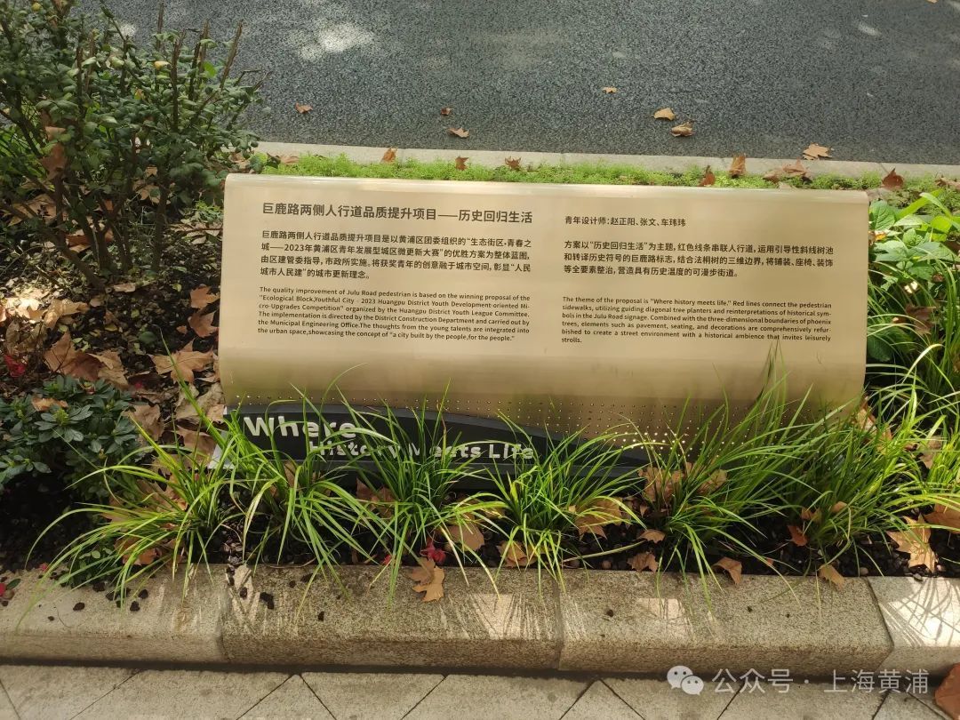 巨鹿路黄浦段是黄浦区结合架空线入地工程打造精品示范道路的成果之一。去年,区建管委以架空线入地和杆箱整治为契机,结合团区委举办的2023年青年发展型城区微更新大赛,将“巨鹿路两侧人行道路面铺装”作为生态文化景观专业组比赛点位,通过居民需求满足、空间结构改善、城区风貌提升、历史风貌延伸四个方面,向全社会青年征集优秀设计作品,通过选拔最终将优胜方案由区市政所落地实施,焕新巨鹿路,彰显了“人民城市人民建、人民城市为人民”的重要理念。