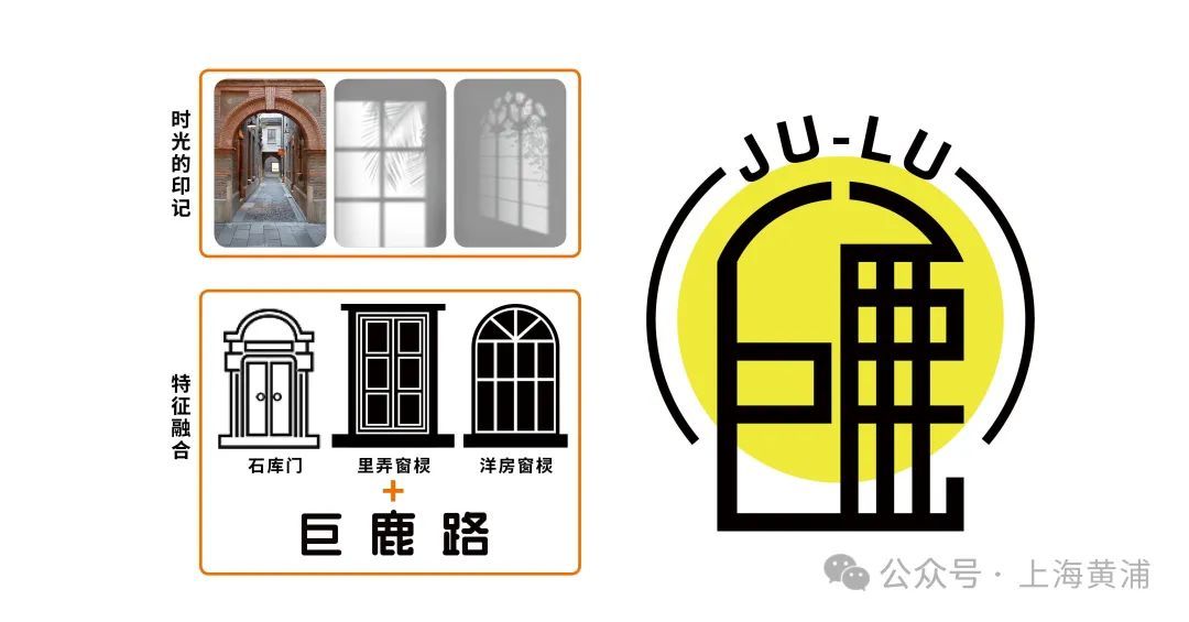 设计师着眼于伫立百年的老建筑,对巨鹿路独特的文化符号进行提取,将承载时光流转与光影变化的石库门形态与窗棂元素和“巨鹿路”文字相结合,将“巨鹿”嵌在窗棂中,更镶嵌在时光里,形成场地IP。