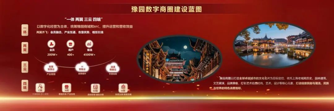 “一体两翼、三云四端”。豫园商圈成功打造数字化经营模式,依托豫园商城、BFC双翼联动,汇聚智慧云、零售云和数据云,服务消费者、商户、管理和政府四端。豫园商圈实现了要素互通、优势放大,成为拥抱文化复兴的重要打卡地。
