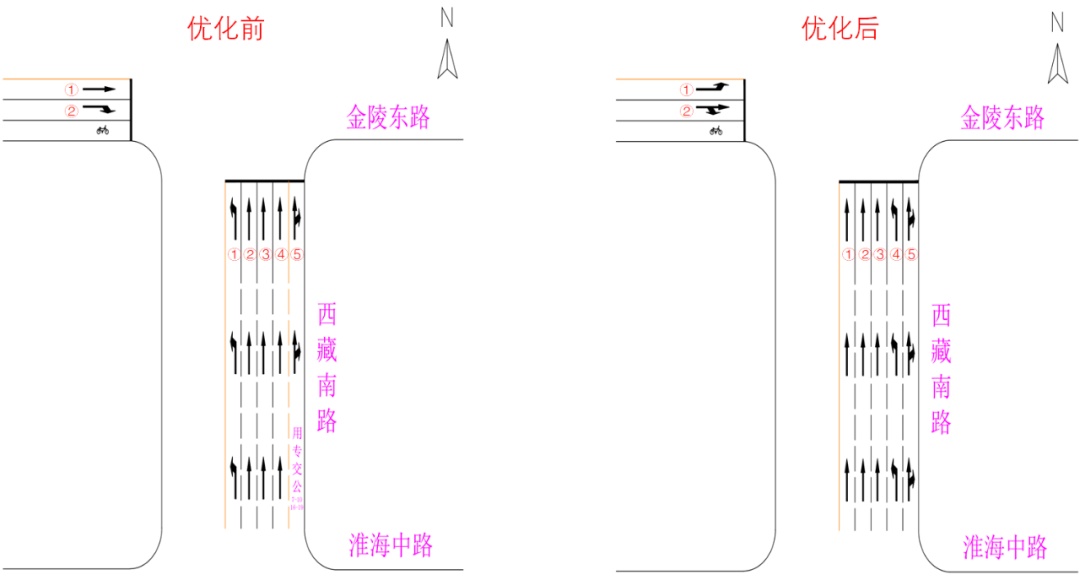 三、将西藏南路/金陵中路西进口1号直行车道改为左转车道,分流西藏南路/淮海中路西进口左转车辆,同时将西进口2号右转车道改为直右车道。