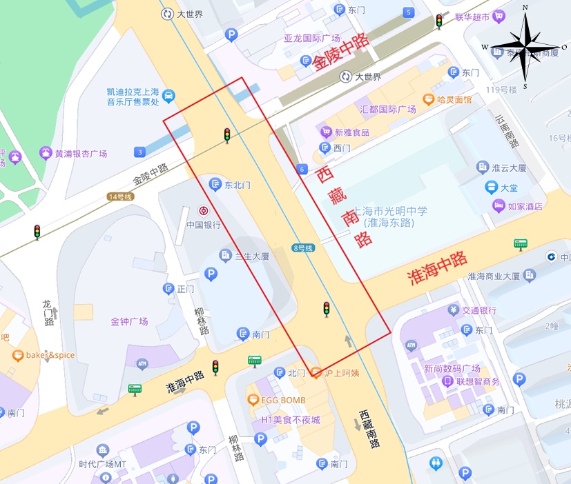 西藏南路/金陵中路位于上海市黄浦区,东西方向为金陵中路,南北方向为西藏南路。该路口南侧为淮海路商业街,北侧为延安高架入口,是西藏南路向北前往延安高架及静安区的主要节点路口,早晚高峰车流量与人流量均较大。且西藏南路沿线存在多个公交站台及多条公交线路,并设有公交专用车道。