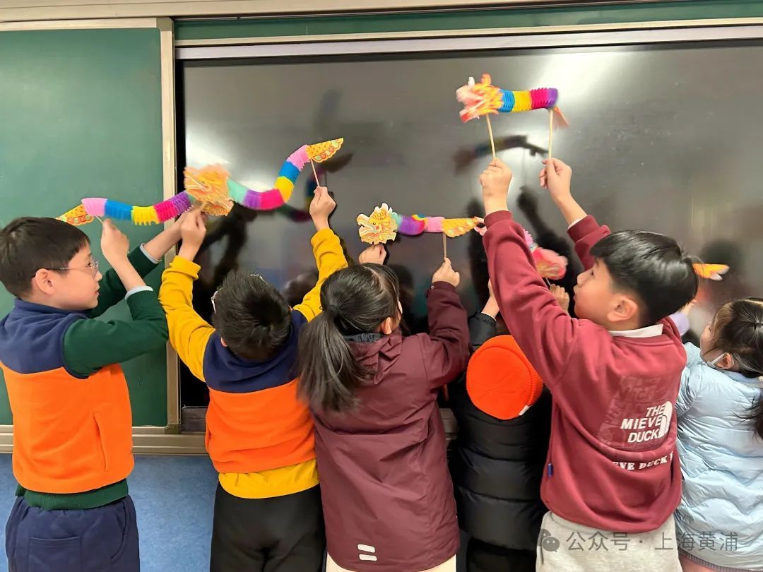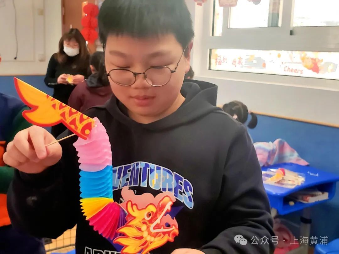 在手工拉花纸舞龙过程中,孩子们又在老师的指导下制作出了一只只可动的拉花纸龙,举着自己亲手制作的纸龙,孩子们高兴地在教室里举办了舞龙大会。
