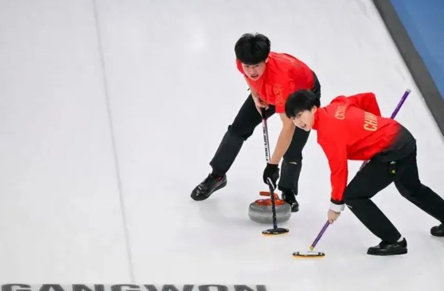 1月27日,中国选手龚长玉婷(右)和许博康在冰壶混合双人循环赛中