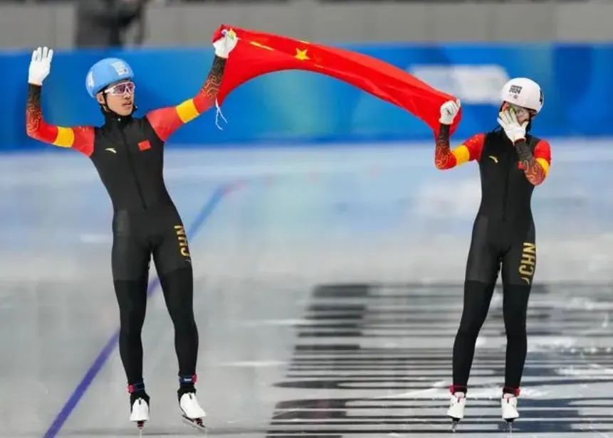 1月25日,潘宝硕(左)/刘昀琪在速度滑冰混合接力决赛后庆祝夺冠