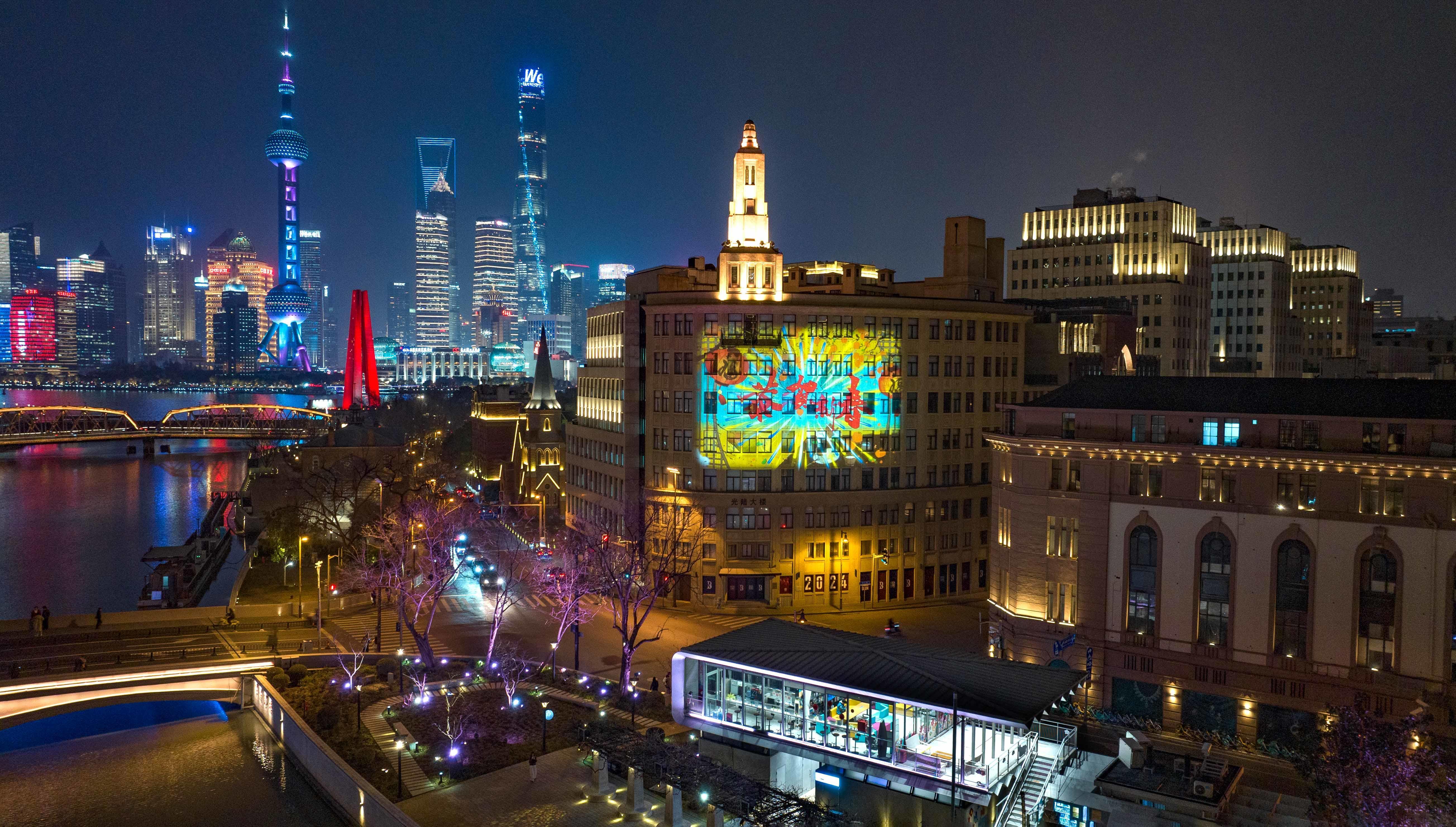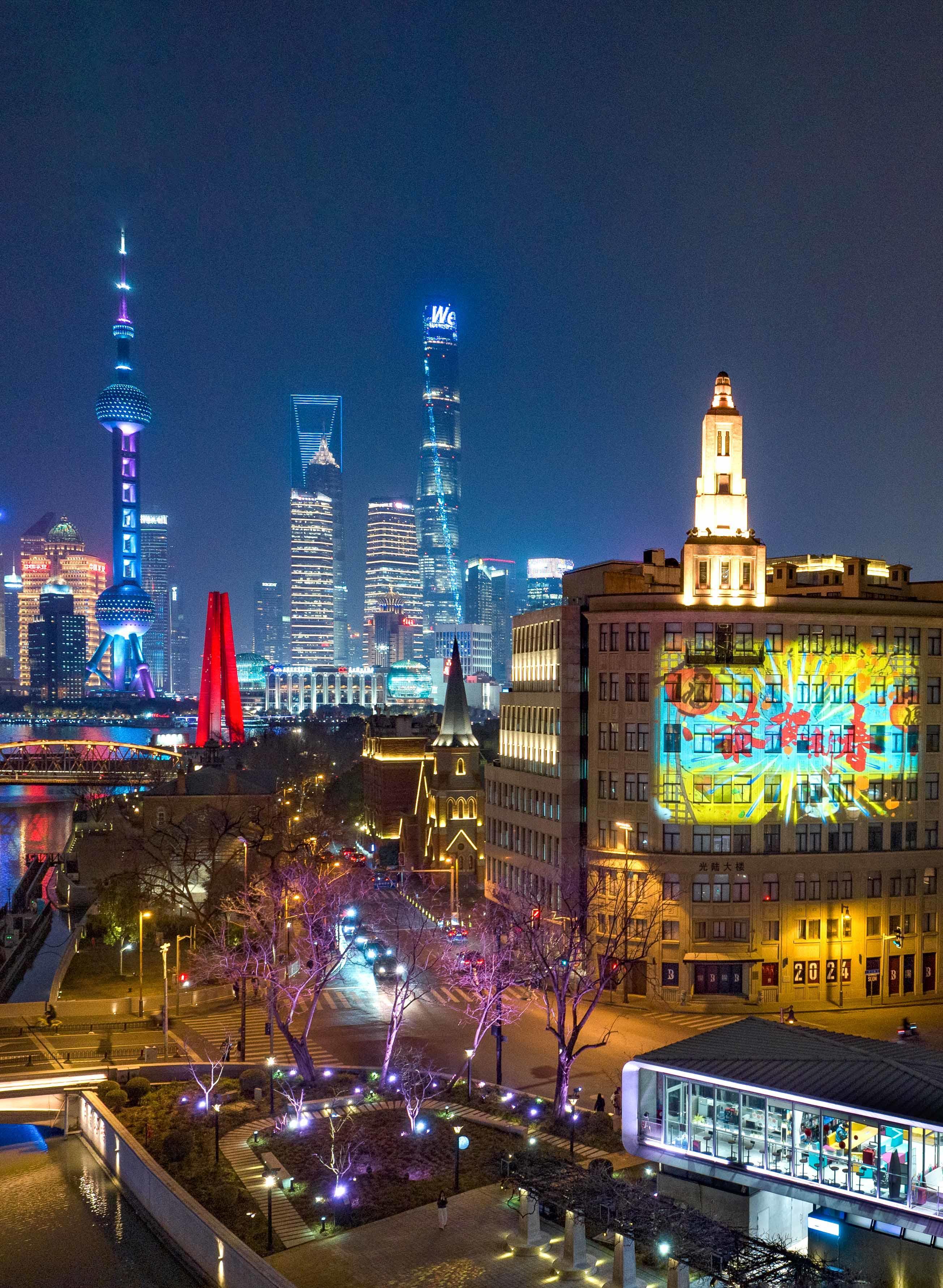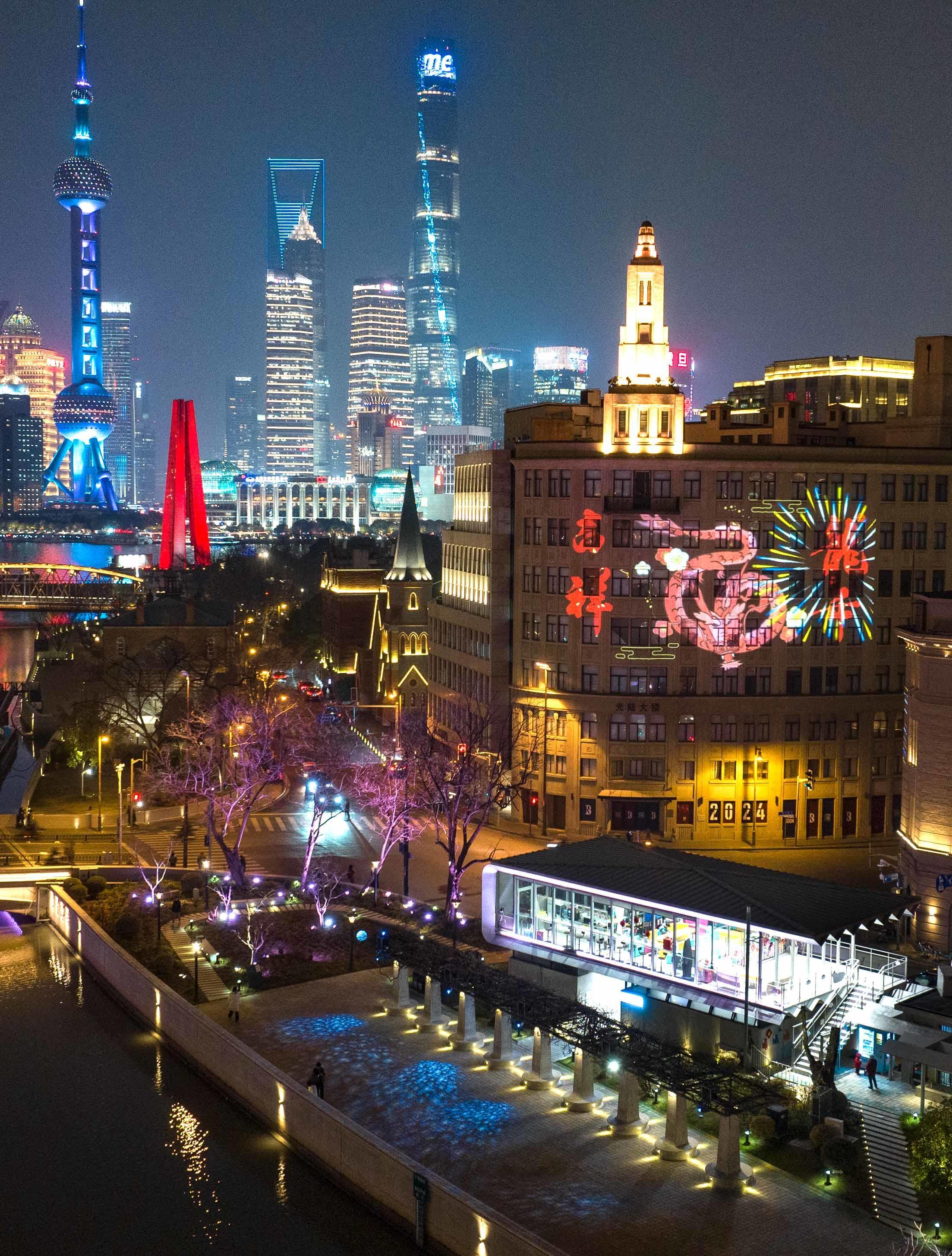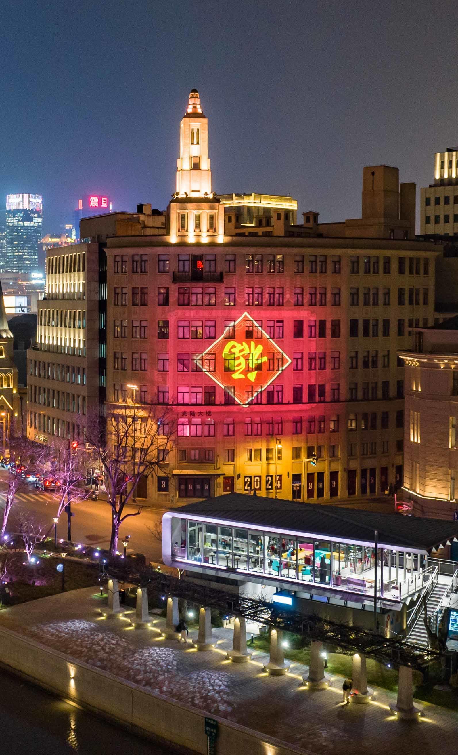 夜幕降临,伫立于苏州河畔,光陆大楼投影秀“闪亮登场”:随着镜头层层推进,火红的春联、烟花、云纹与金黄的“春”字、“福”字、灯笼交相辉映,点亮新年新气象;叩响龙年大门,金龙腾跃送上“金龙贺岁” “龙腾盛世” “龙年吉祥” “龙行大运” “大展鸿图”等新春祝福,寓意“外婆河”福泽市民游客,为城市带来新春吉兆。