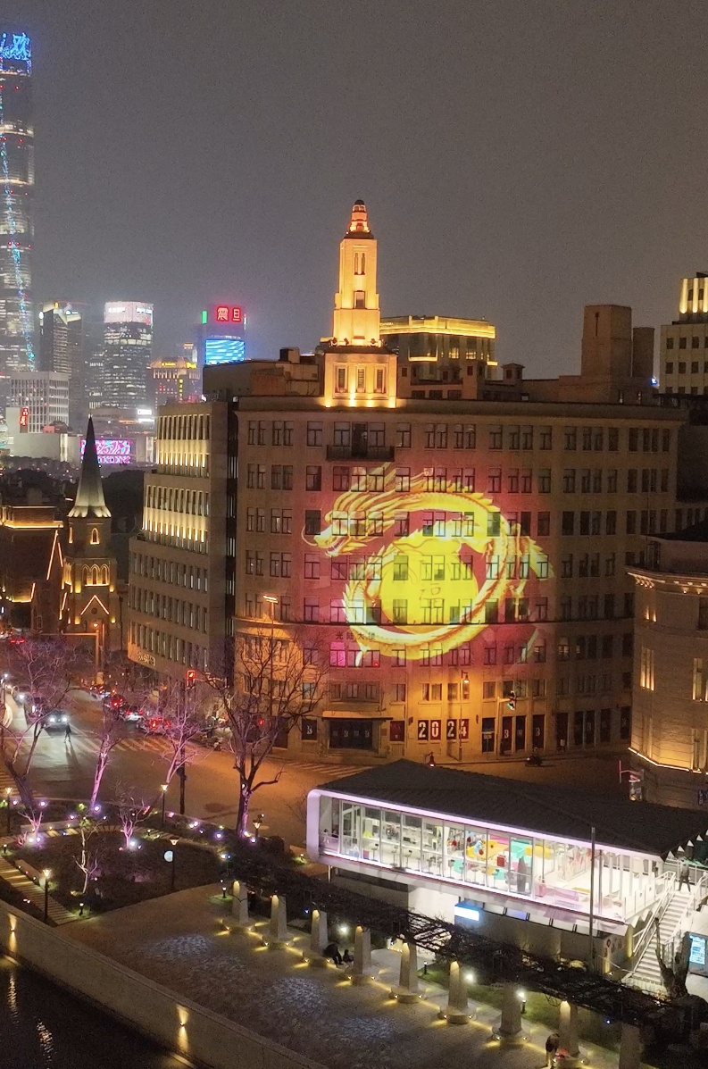 据黄浦区灯景所工作人员介绍,“樱花谷-光陆大楼”作为苏州河文化创意投影秀平台,全新推出“龙跃苏河兆新春”系列创意投影作品,意为借景观照明“照新春”来“兆新春”,为新春佳节更添华彩。