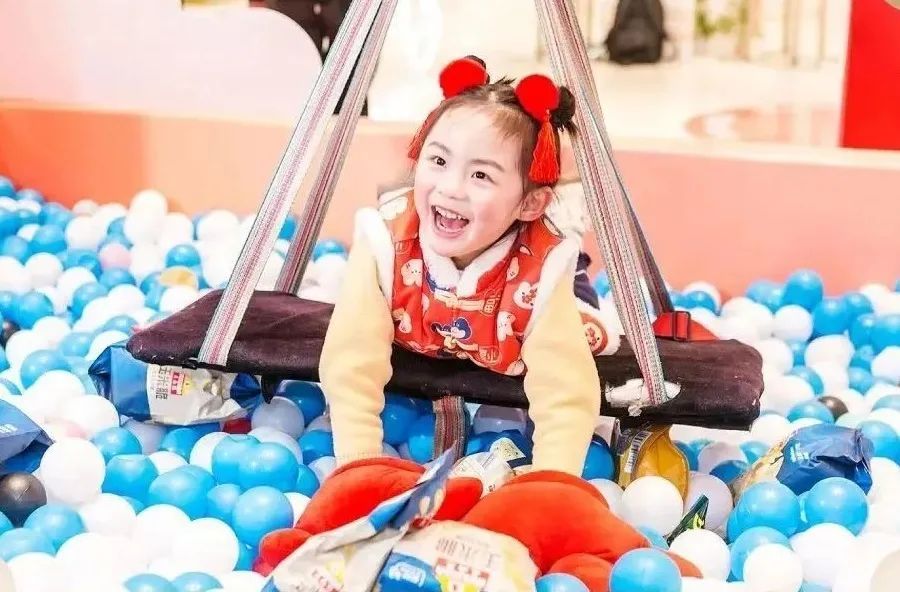游戏参与者躺在柔软的秋千板上寻找藏在泡沫球间的惊喜,并尽力用双臂圈起更多的年货。每人仅一次机会,抱到多少即可收获多少,这种自给自足的满足感和成就感,吸引了不少小朋友前来挑战。