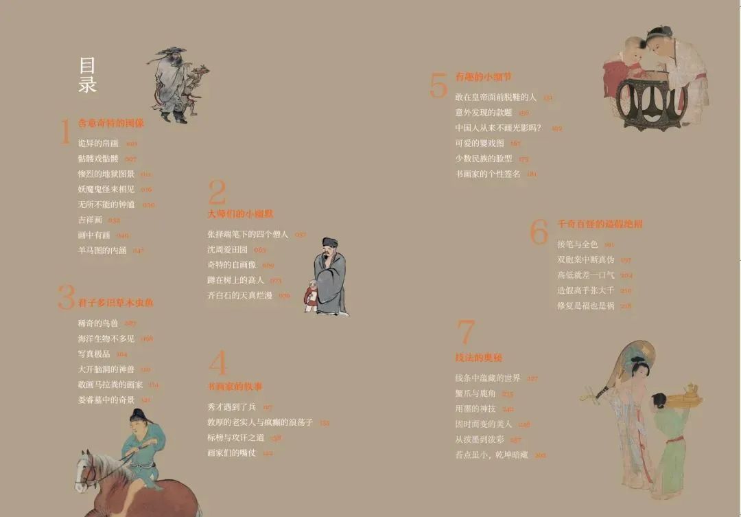 当面对中国画时,是否有很多疑问,“中国画,看不懂?”“中国画,很枯燥”“中国画,画的不像”。其实中国画很有趣。本书试图打破大家对中国画的固有印象,以轻松的语言、有趣的视角为读者带来不一样的中国画。第一章为含意奇特的图像,本章列举了中国画中的一些具有奇特内涵的作品,如“骷髅画”“地狱图景”“妖魔鬼怪”“吉祥画”等。第二章为大师们的小幽默,画家们不但擅长作画,还经常在画中藏着自己的“小心机”,如有些画家喜欢把自己画在树上,或者沈周特别喜欢画田园景象。画家们还喜欢画奇奇怪怪的动物,包括海洋生物,有一位知名画家还敢画马粪,在第三章中读者会与中国画中的动物们相遇。画家们也很有个性,有些人放荡不羁,有些人老实憨厚,有些人爱打嘴炮,在第四章中会看到这些有鲜活个性的画家。在中国画中,还有一些不易发现的小细节,例如敢在皇帝面前脱鞋的人,他是谁呢?中国画也画光影,画家们的签名也千奇百怪。中国画的造假手段也层出不穷,甚至有些大画家亲自参与造假,这部分的故事将在第六章呈现。最后一章,读者将会看到中国画线条和颜色中包含的小趣味。