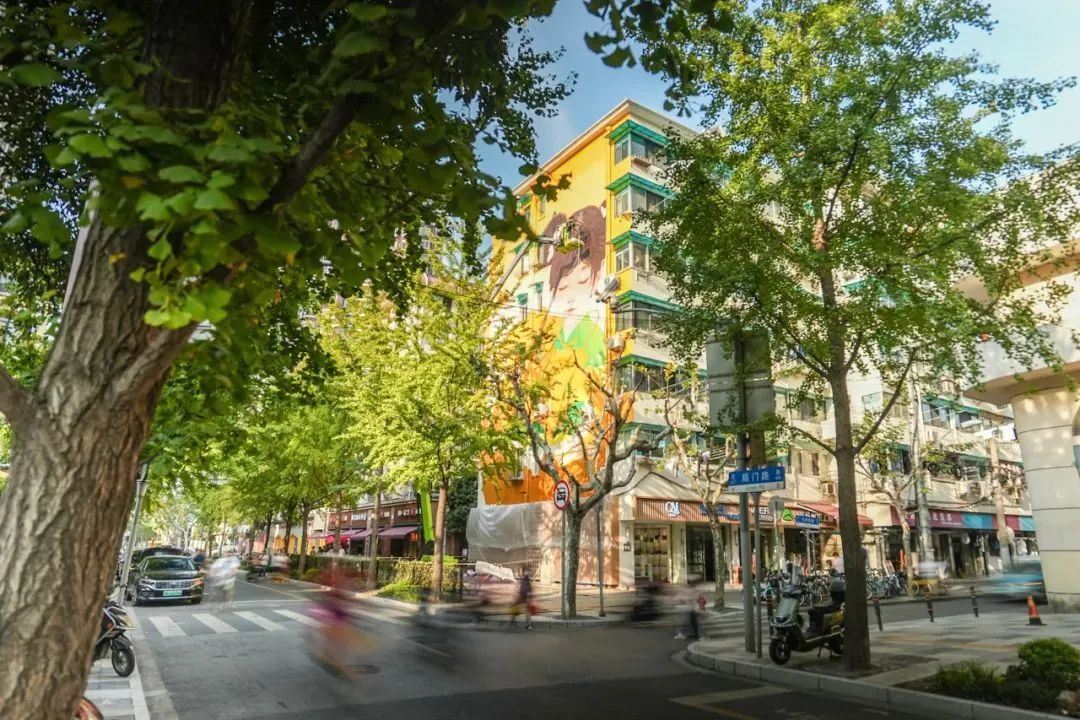 夕阳西下,局门路上还有一幅《银杏少女》的巨幅墙画,巨幅墙画下,总会有居民驻足观看,回味“银杏少女”的思考。