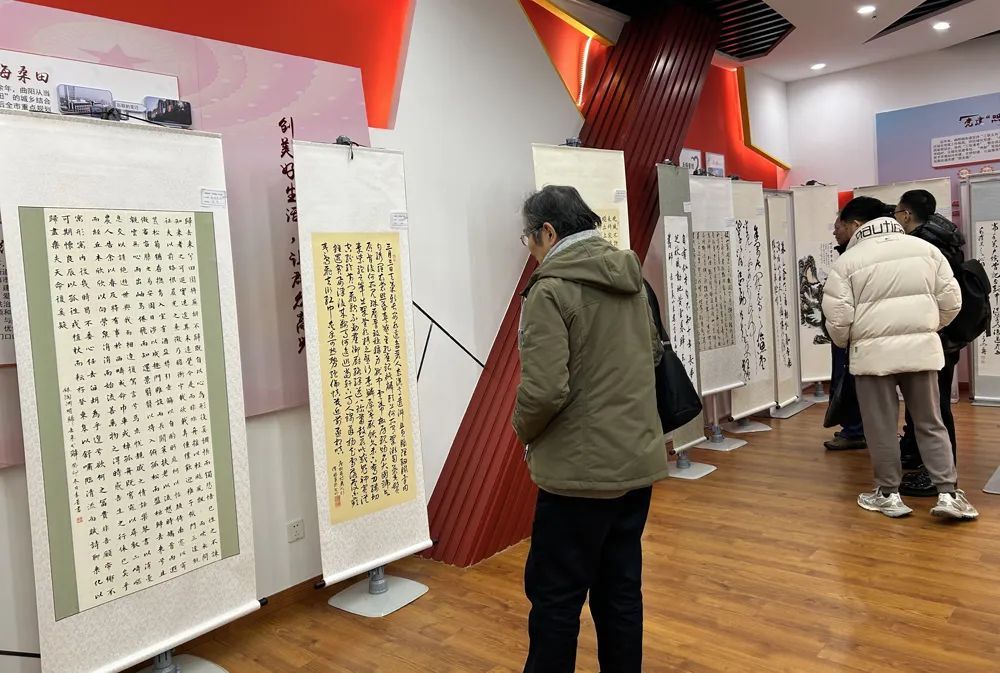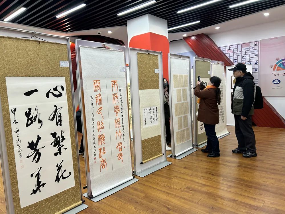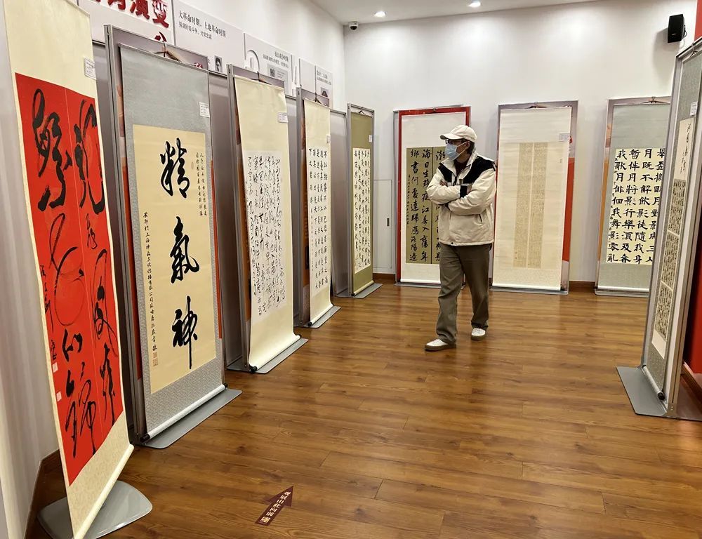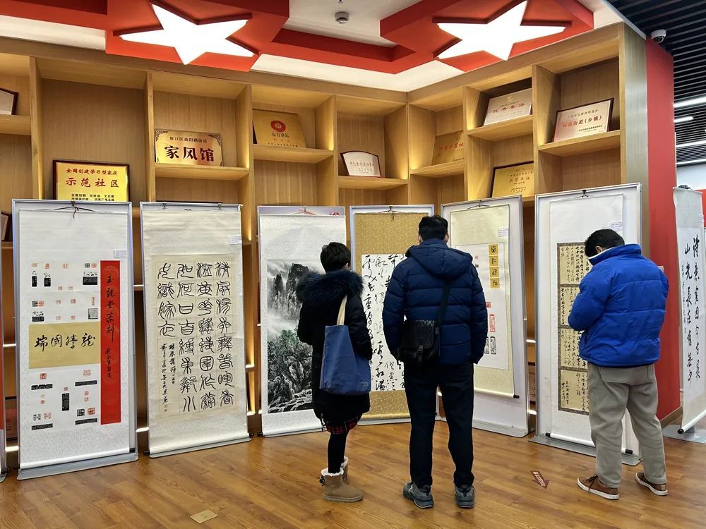 在位于曲阳路街道社区文化中心四楼的展厅内,书法、国画、篆刻等艺术作品沿墙面整齐悬挂,前来打卡的居民或驻足欣赏,或拍照留念,大家放慢脚步,感受着每一幅作品所传达的情感和故事。