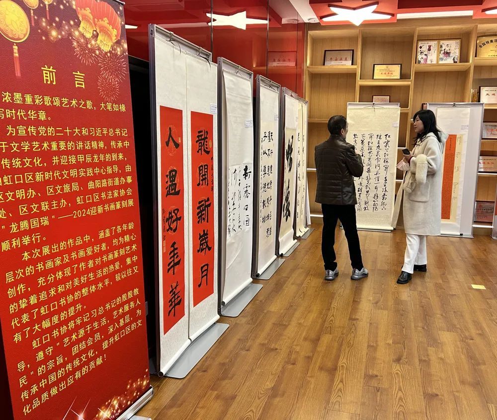 书法、国画、篆刻……2月6日下午,“龙腾国瑞——虹口区甲辰龙年迎新春书画篆刻作品展”在曲阳路街道社区文化中心开展。