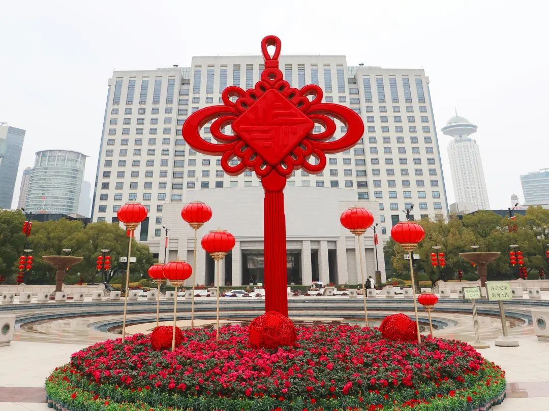 本次人民广场区域春节氛围布置,主体造型为一个6米多高的“中国结”,装点在人民广场喷水池的南侧,采用富有传统文化象征意义的中国结——方胜结,象征着一帆风顺、出入平安,是对过去岁月的告别以及对新年的美好期望的传递。脚下环绕着精心布置的花卉和经典的中国传统羊皮灯笼和柳编藤球,共同营造出温馨和谐的节日气氛。连日来,火红喜庆的布置也让不少市民游客慕名而来,纷纷在“中国结”前拍照留念。