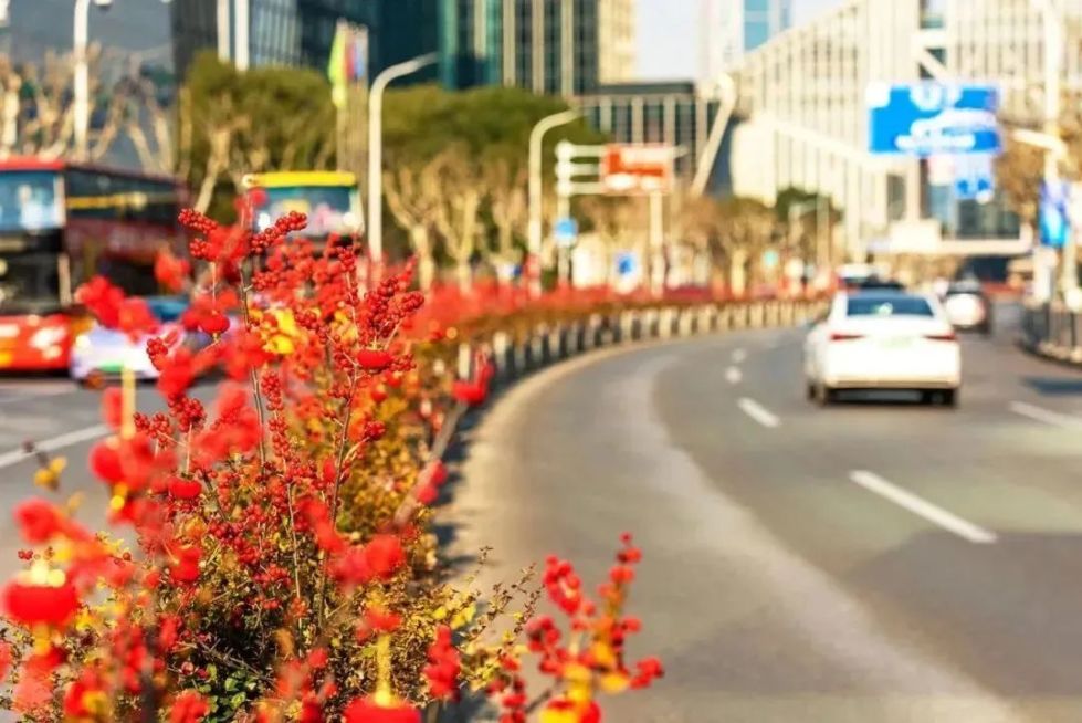 今春,陆家嘴环路中间隔离带的花箱里特别种植了北美冬青,满枝火红的小果旁缀饰着小灯笼,车流人流中,这抹不容忽视的红,为新年更添红红火火的美好寓意。