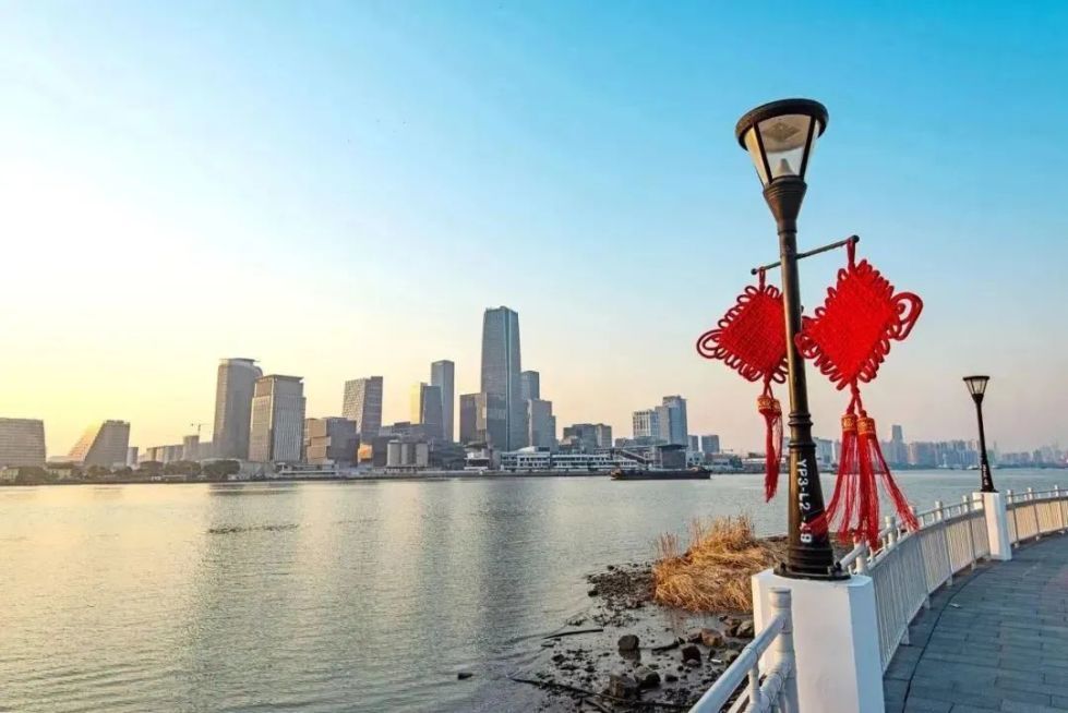 继续一路向南,滨江东岸的前滩地区,友城公园整装一新,红灯笼、中国结布满滨江岸线,随江风舞动。在漫步道上驻足,看航船过江,红日映水,波光粼粼。