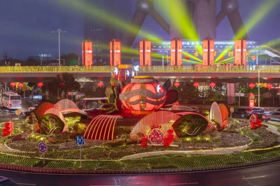 明珠环岛花境中央的巨大灯笼,与四周装饰的小灯笼相映成趣。古朴的红色祥龙装饰牌格外亮眼,点缀在常青绿植中,带来视觉上的跃动,更添喜庆氛围。