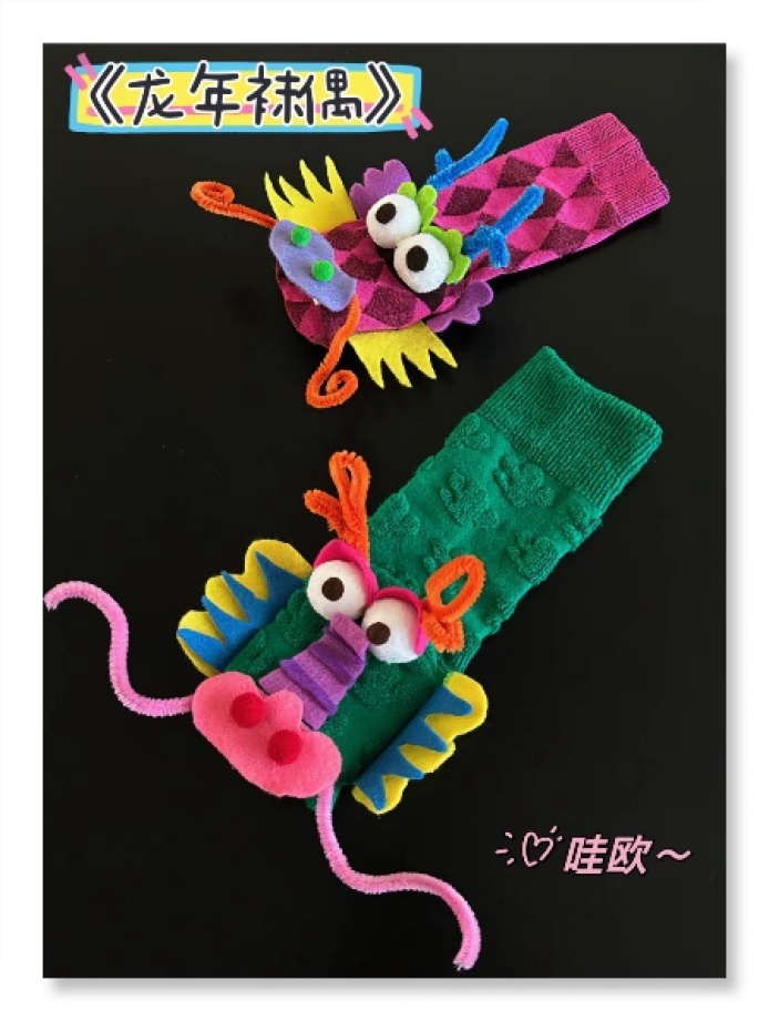 龙在中国文化中承载着丰富的象征意义,既是自然的守护者,也是皇权的象征,同时也是力量、财富、吉祥以及民族精神的体现。本节课我们以龙为主题,袜子为载体,并且运用多种综合材料,一起动手制作一只有趣的袜偶吧!