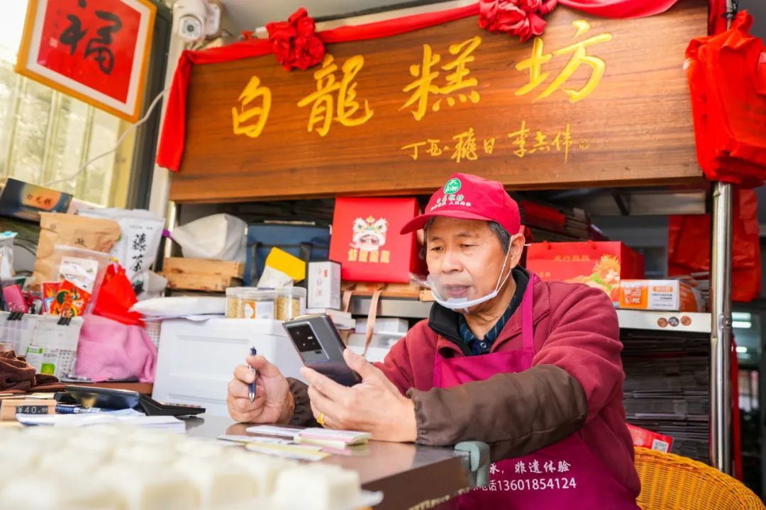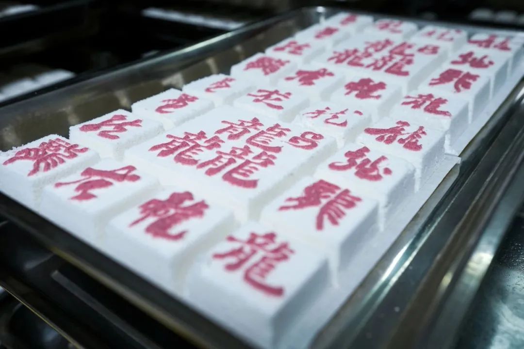 白龙糕坊面积不大,但名气不小。陆师傅说,自己从不做广告,一块大招牌也是低调地挂在店内。但仍抵挡不住慕名前来的食客,在干溪街上寻寻觅觅,直到尝到那一口香甜软糯。如今,人们遇上搬迁、结婚、生子等喜事,都会请亲朋好友吃糕,讨个好口彩。龙年吃白龙糕,也颇为应景。而陆师傅为了满足不同的客户需求,更是定制上百种模具。今年,陆师傅特地定制了龙年限定的新模具,每块糕上是不同时期的“龙”字写法,中间则是“龙行龘龘”四个字,颇受老客户欢迎。由于是纯手工制作,夫妻二人忙碌一天大约能蒸出500屉白龙糕,供不应求。
