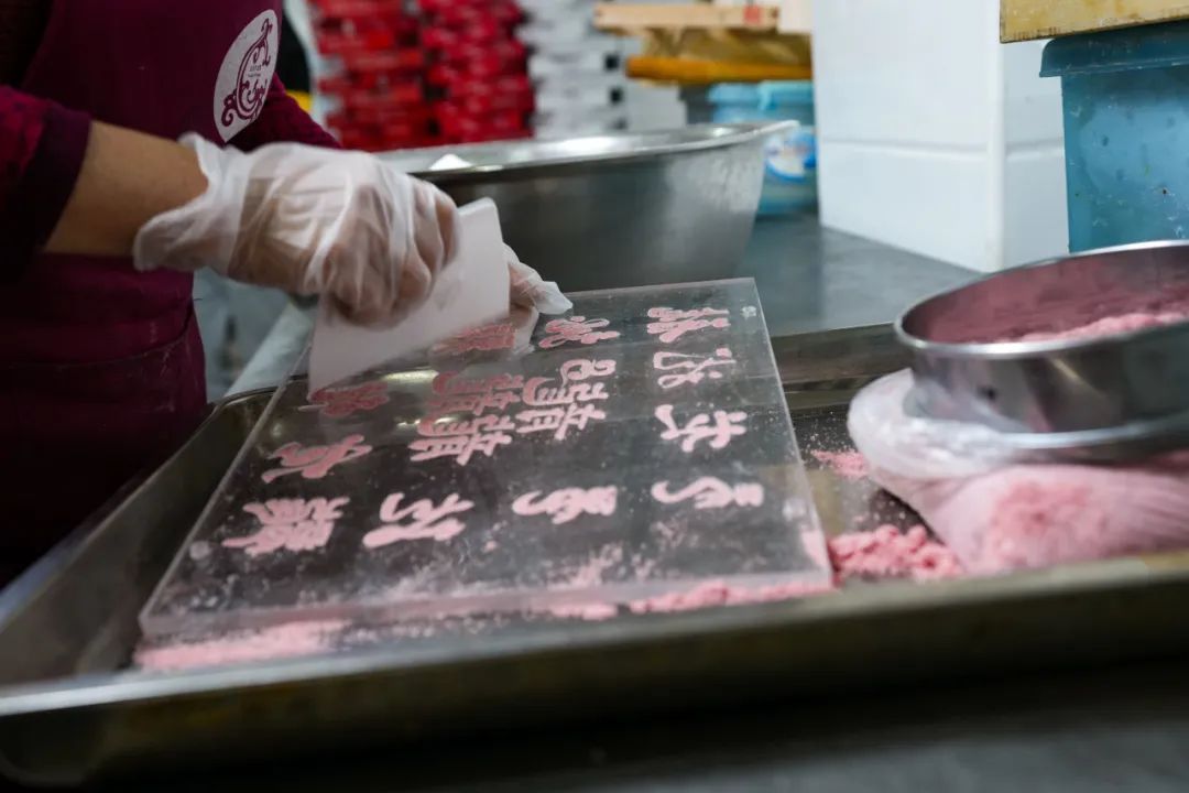 做了20多年白龙糕的陆师傅,每一道工序都烂熟于心。将提前泡好的米磨粉、过筛后,他用刚刚好的力道,将洁白又细腻的米粉铺满磨具。太过用力,米粉压得太实,糕就不够松软。再用刚刚好的手感,让每一小块糕都包裹着相同分量的豆沙。少一点,一口就吃不到豆沙馅;多一点,就失去了甜而不腻的平衡感。奘好的白龙糕,还得等一等才能上蒸锅。陆师傅说,白龙糕在蒸之前,还有一道“醒粉”的工序,是为了让大米和糯米配比而成的米粉更好地融合。而醒粉的时间长短,要根据湿度、温度灵活调整。