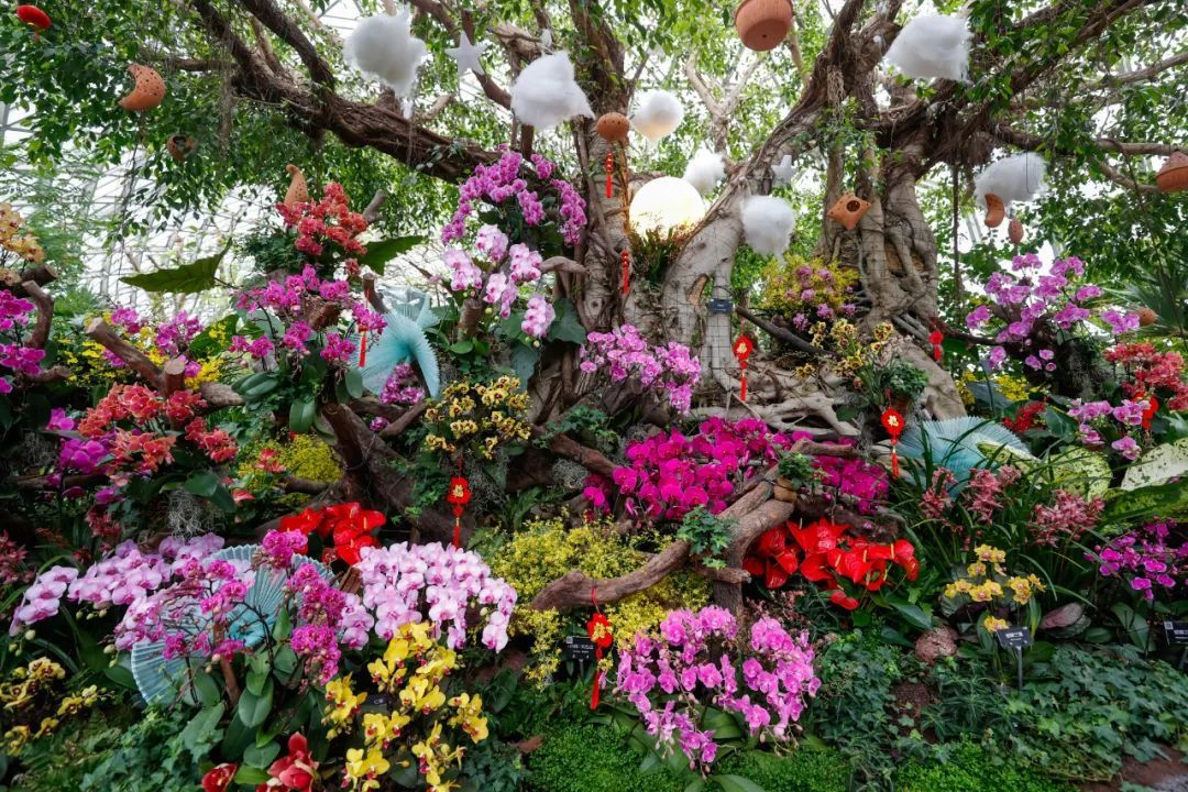 本次花展以“龙”为主题,共设置九龙闹春、龙潭春晓、龙游四方、龙迎富贵4大展区,处处花团锦簇,处处美不胜收。“九龙闹春”展区位于一号门大厅内,以牡丹为主体,“龙”元素植物为辅穿插在其中。“龙潭春晓”展区位于矿坑花园的台地区,主要展示50余个品种220盆催花牡丹,通过高超的园艺手段催花而放,为冬日矿坑增添提前而至的春色。“龙游四方”展区位于展览温室A馆(热带花果馆),将杜鹃花作为主打花卉,以游花景、染花妆、登花台和品花韵四个主题花境为特色,红、橙、黄、蓝紫四色系为线索,将分布于长江流域的杜鹃分别与青海、云南、湖北、上海四地文化融合,展示杜鹃花在不同地域中绽放出的多面魅力。“龙迎富贵”展区则位于二号门展览温室共享空间个体展馆,以个体精品牡丹品种74个约150盆牡丹为展陈主体,并配以品种科普介绍。