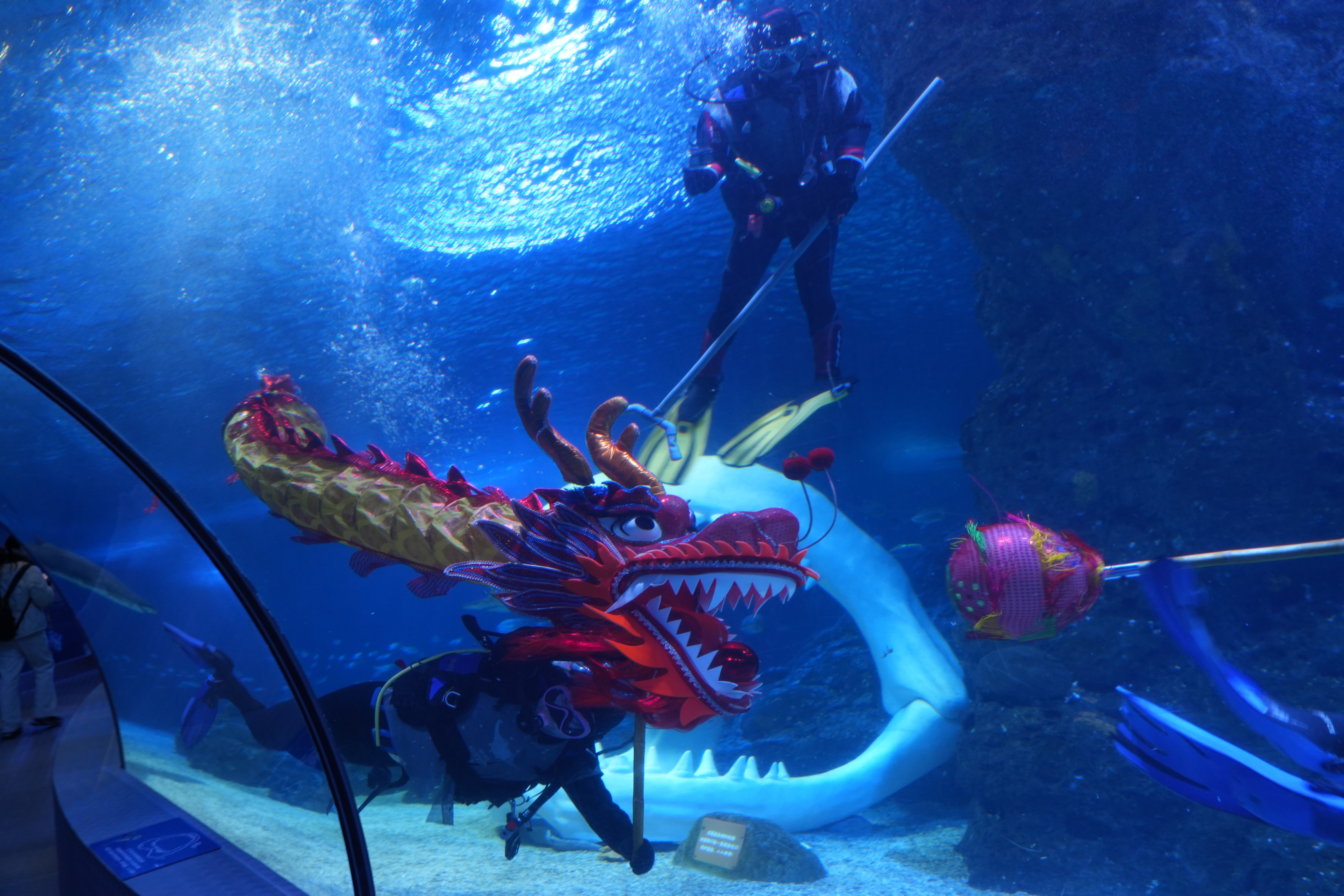 10点多,结束了例行清扫工作,就进入每年春节期间才会上演的水下舞龙表演了。3名工作人员将特制的舞龙道具在水中徐徐展开,一名工作人员用工具轻轻推开前方的挡路的鱼,小吴手举着龙头浮游在水下世界,将美好的新春祝福送给市民游客。