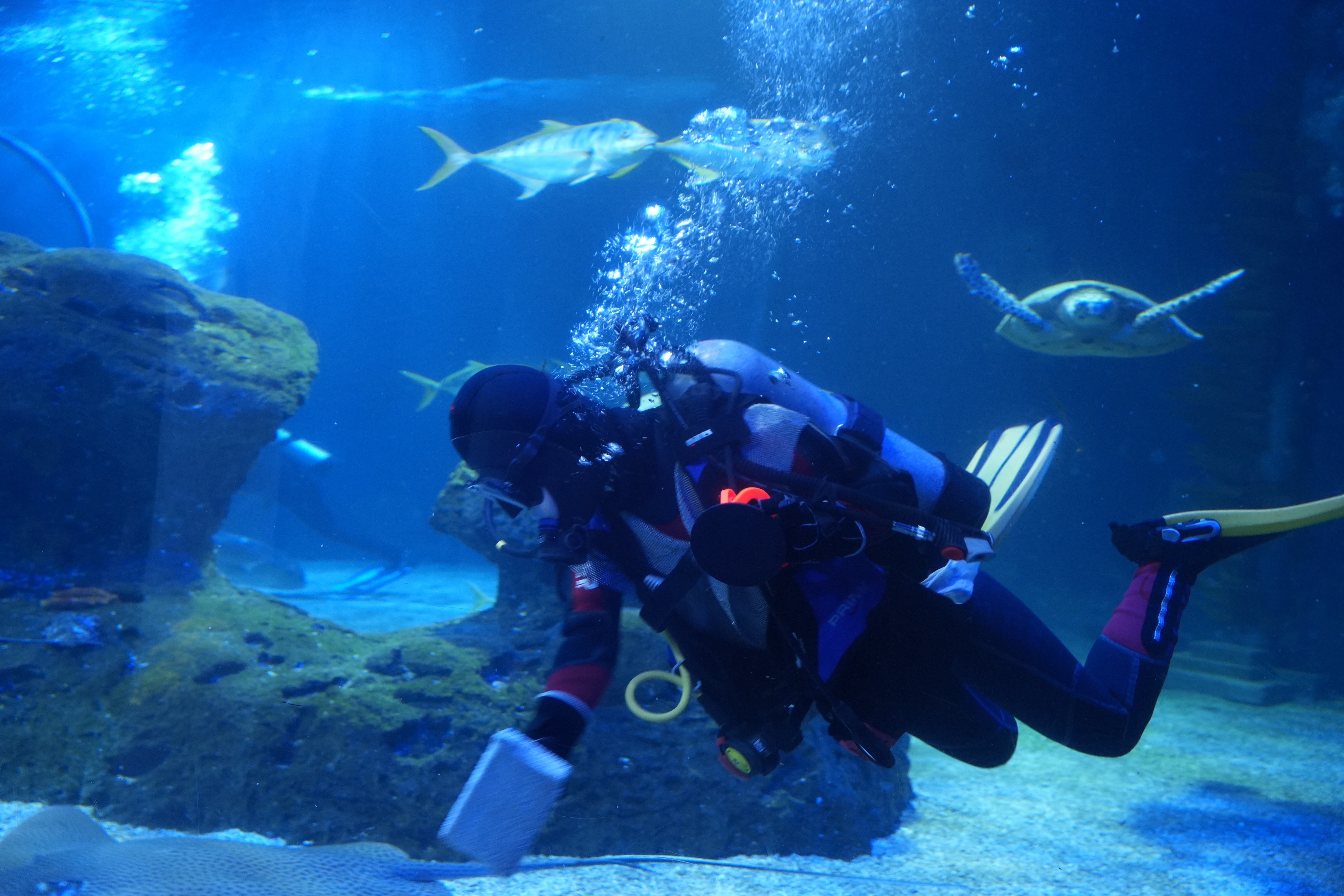 不过看起来轻盈的表演背后可不轻松,为了确保潜水员安全上岗,吴小妮身上所背的安全衣犹如“铁布衫”,再加上氧气瓶足有她体重2/3的重量。入水后,她首先需要清扫动物们的粪便,擦出玻璃上的绿藻,每一次潜水都是小吴对海洋的热爱和对工作的尊重的完美体现。