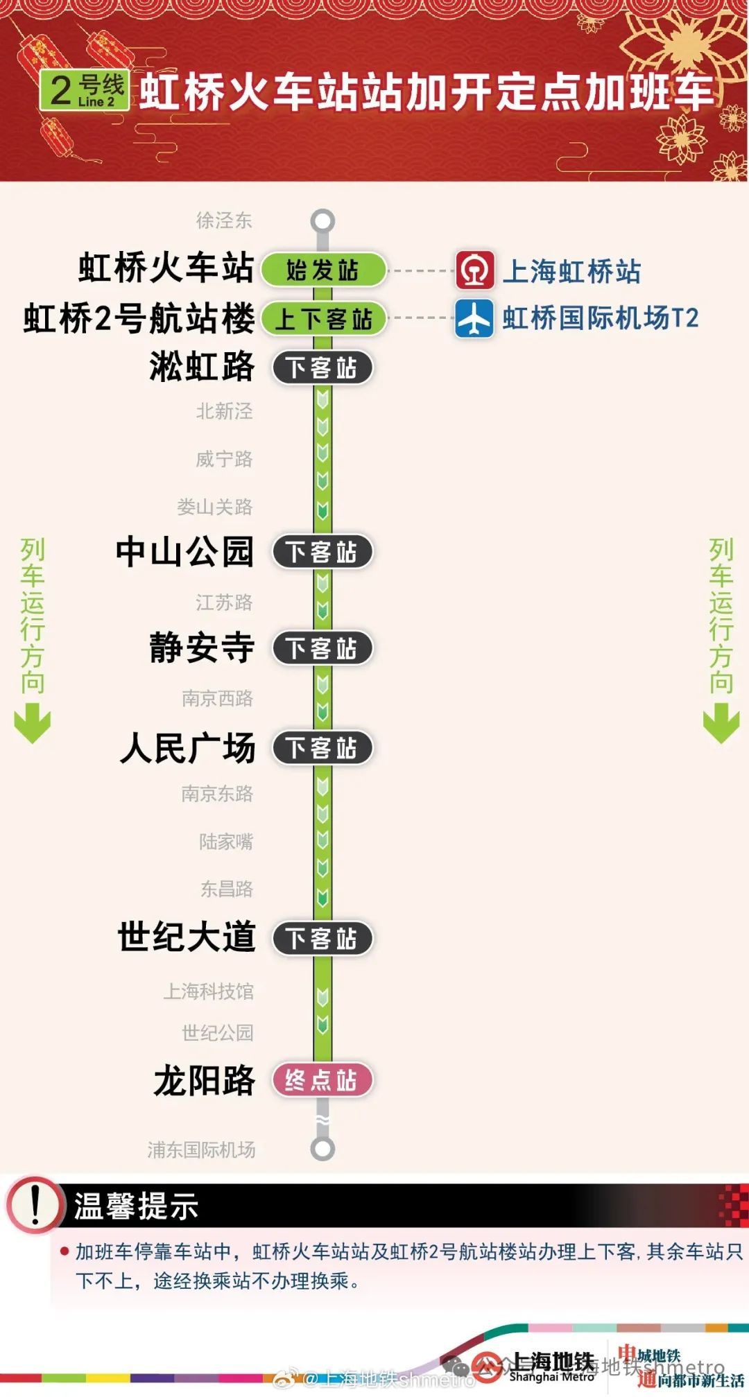 同时,为疏散今日夜间浦东国际机场抵沪旅客,今晚上海地铁2号线浦东国际机场站将开行定点加班车,最晚发车时间为2月17日0时。加班列车沿途仅停靠龙阳路站、世纪大道站、人民广场站,终点站中山公园站。上述各停靠站点都只下不上,途经各换乘站不可换乘。请各位返程乘客根据列车广播提前做好下车准备。