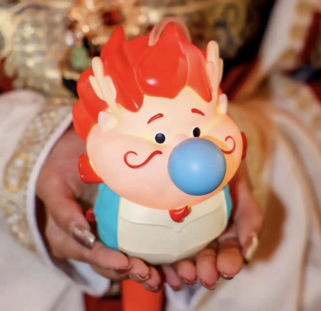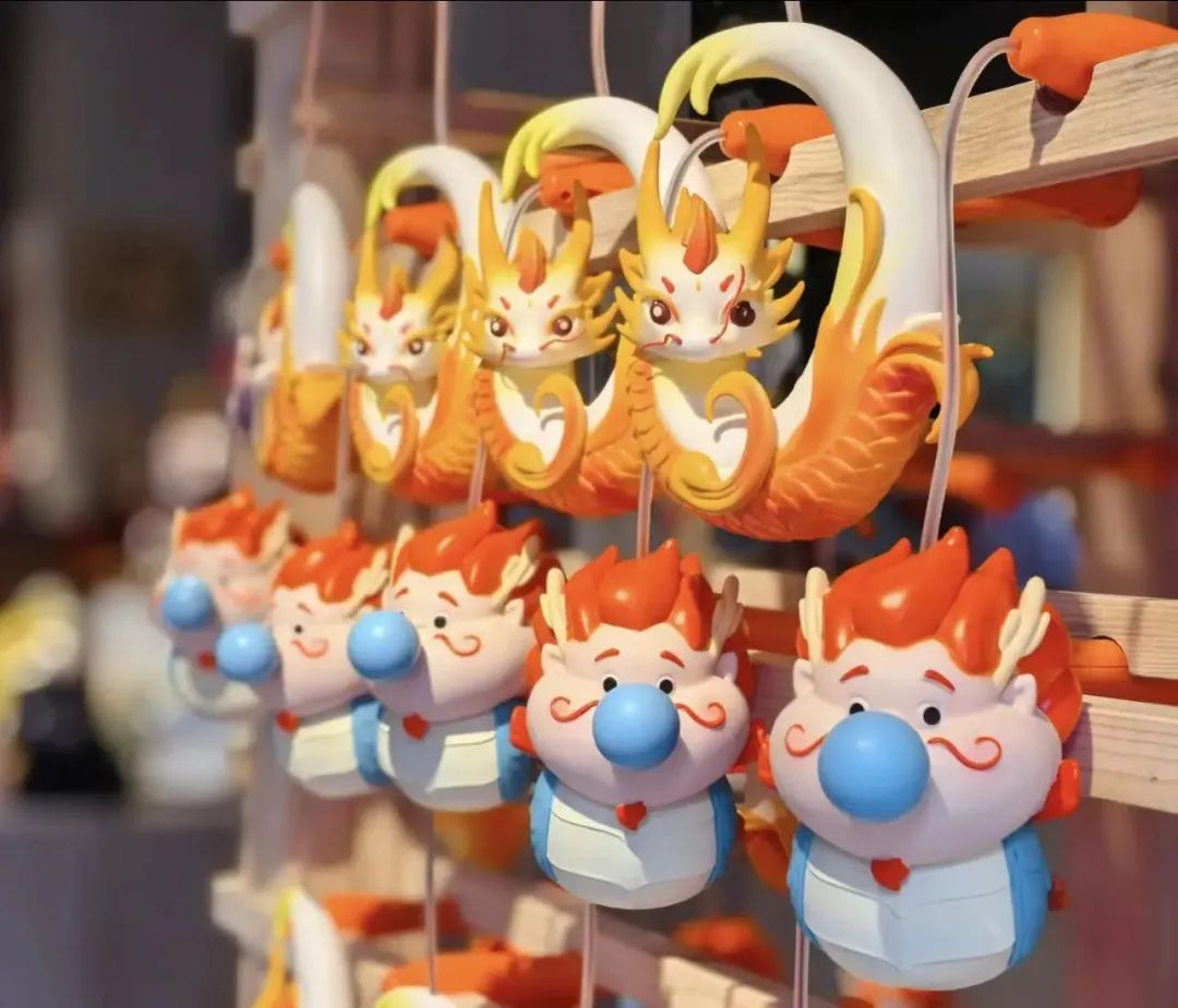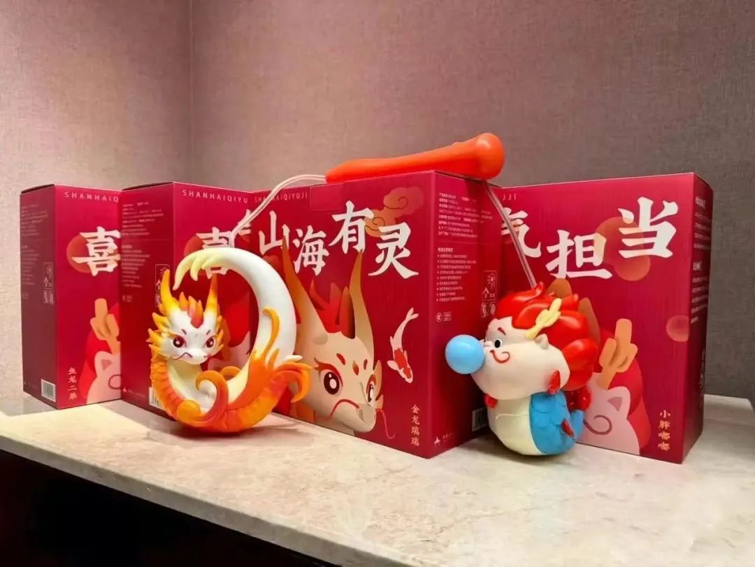其中,“金豫龙瑞瑞”参考了“汉玉龙”造型,呈“C形”盘龙姿态,尾巴连接处还加入了浪花元素,既增加了趣味性,又蕴含“飞龙跃海”的美好祝愿;“鱼龙嘟嘟”的灵感则来源于豫园灯会主题“山海奇豫记”中的瑞兽“鱼龙三兄弟”里的二弟,其微胖身材福气尽显,憨态可掬地吹着泡泡,寓意“神龙吐珠”,播撒喜气与平安。