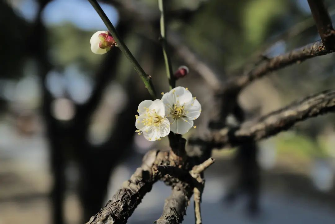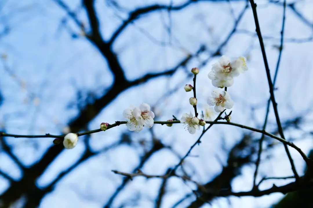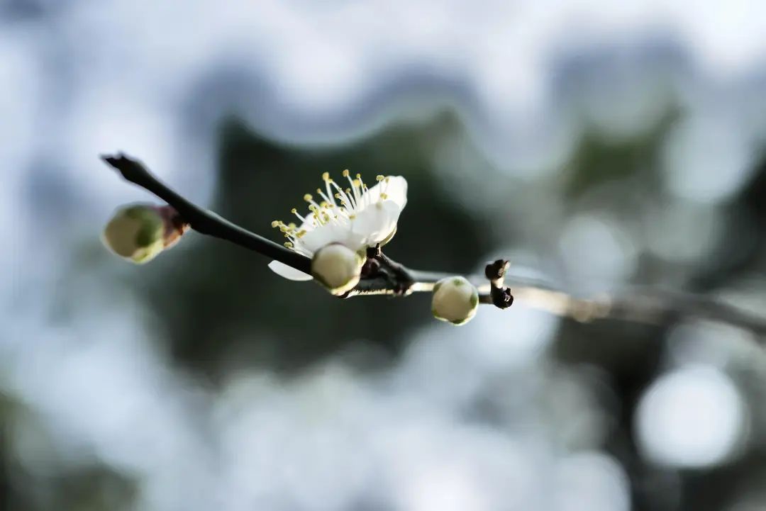 白色的梅花遗世独立,静待枝头迎风摇曳宛如窗前的白月光。没有红色那么艳丽张扬,却多了一些文气。