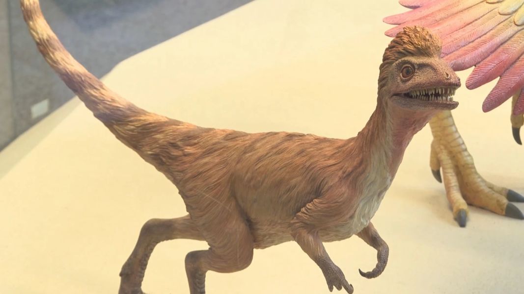 另一件展品叫做中华龙鸟,是最早发现的羽恐龙。科学家从其带有锯齿的牙齿和其腹中发现的蜥蜴等哺乳动物残骸推断,中华龙鸟是以肉食为生。2010年,科学家通过将化石羽毛中的黑素体与现代鸟类羽毛中的黑素体进行比对,首次揭示了中华龙鸟的真实颜色——其背部呈现出红棕色或栗色,尾部有着白色的环带。“我们热河地区发现了大量的有羽恐龙和鸟类的化石,为鸟类起源于恐龙的理论奠定了非常坚实的化石证据基础。”黄灵丽说。