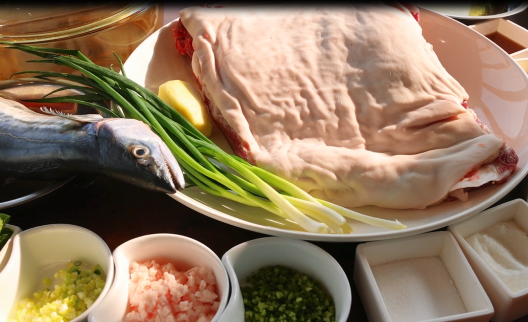 食材选用的是新鲜的鱼肉和羊肉。首先将新鲜的鱼从中间切开,用刀将鱼肉刮出,剔出鱼骨。切下鱼头、鱼皮,放在一边留着熬汤。将鱼肉捣碎,放在碗里揉捏,接着加入配料,少许盐、小葱、蛋清、水淀粉和肥膘粒。再次揉捏混合,将鱼肉打上劲,保证鱼肉的弹性。