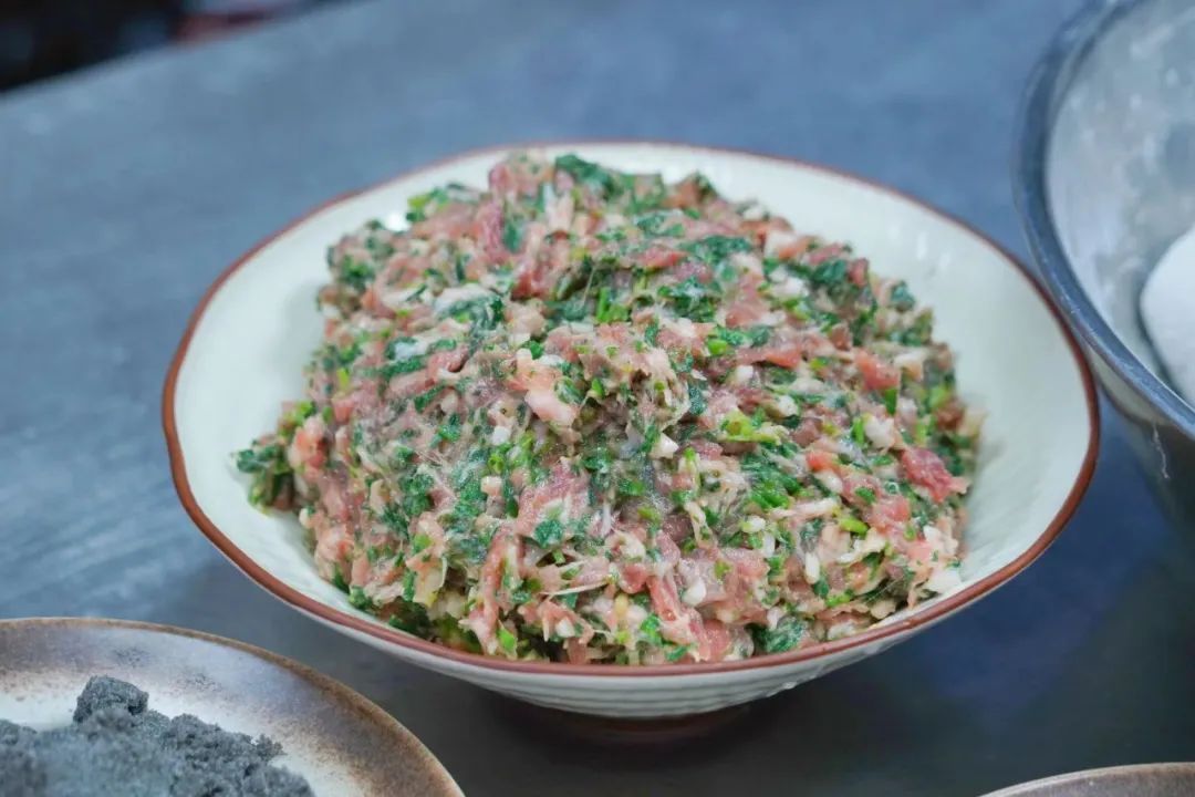把切好的荠菜和山药拌入基础肉馅,山药使肉馅更嫩。