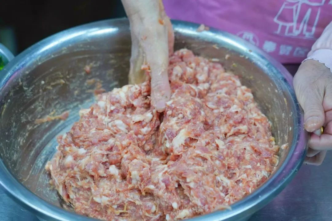 肉馅中放入盐、糖、味精和少许鲜酱油,打3个鸡蛋搅拌均匀。