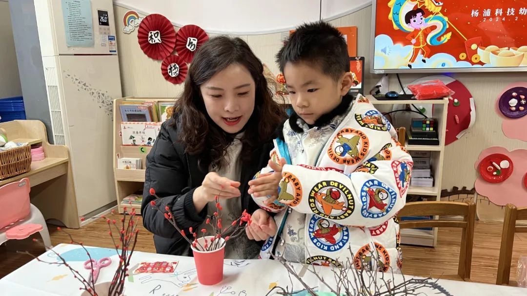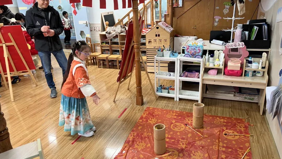 在小朋友们的舞龙表演中,此次活动正式拉开了序幕,投壶、套圈、手工制作……孩子们穿上传统服饰,在家长的带领下,逐一体验嘉年华现场的民俗项目,在“枯木逢春”手工制作现场,小朋友们利用树枝和橡皮泥制作梅花,粘贴在树枝上,这种“枯木逢春”的即视感,让家长和孩子都很惊喜。