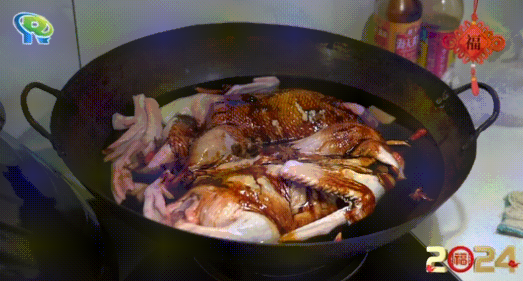 5.加入几块冰糖,用大火收汁。在收汁的过程中,要不断将汤汁浇在鸭身上,这样可以使鸭子的颜色更加均匀,不易发黑。
