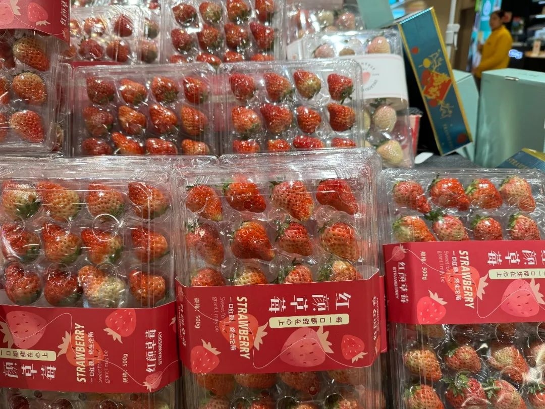 其中红颜中果草莓一盒500g售价29.9元,而去年12月中旬刚上市时,同等规格的草莓售价为39.9元。货架一边的浪漫红+纯真白双色草莓礼盒售价69.8元/500g,本地章姬奶油草莓售价24.9元/300g,价格均比春节前有所降低。