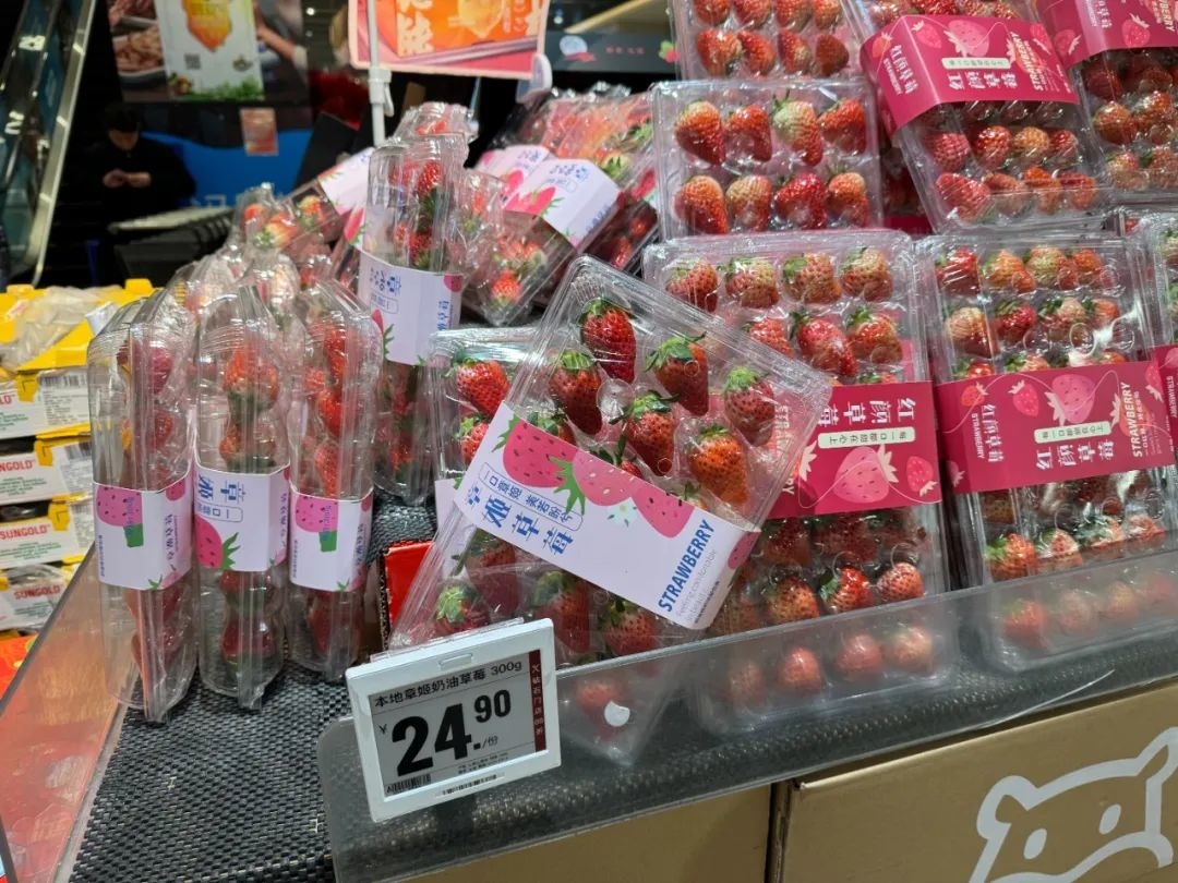 记者先后走访了BHG生活超市、永辉超市等多家商超发现,丹东、佳沃、红颜等品种的草莓散发着阵阵清香,有的按盒出售、有的按斤售卖,价格与去年11月调查时相比都出现了不同程度的下跌。其中鑫海韵通大卖场石园店的草莓价格由此前58元/斤降至24元/斤,BHG生活超市的草莓价格由此前59.8元/斤降至33.8元/斤,永辉超市(新世界店)同款草莓价格由此前69.8元/盒降至39.8元/盒。