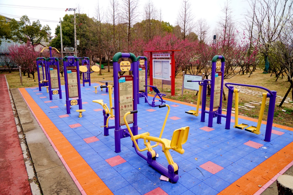 梅坞旁边有一处益智健身苑点,配备双位转腰器、健骑划船器等器械,适合不同年龄段人群进行不同种类的体育锻炼,满足周边村民健身休闲娱乐的多样化需求 。