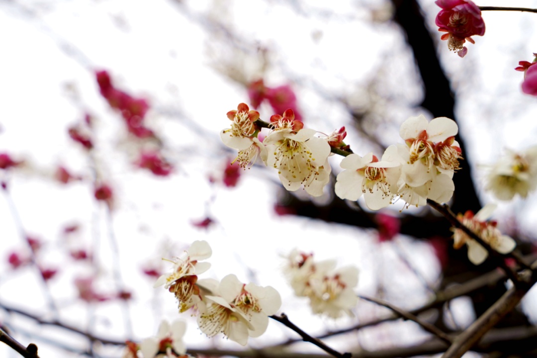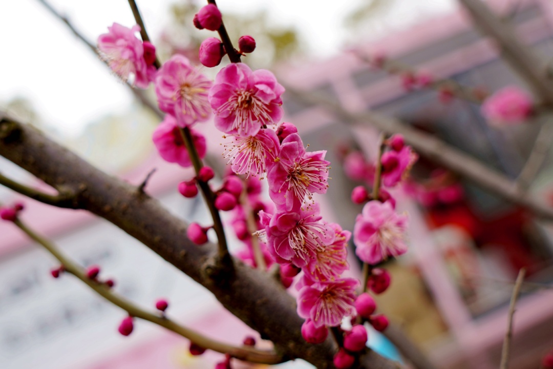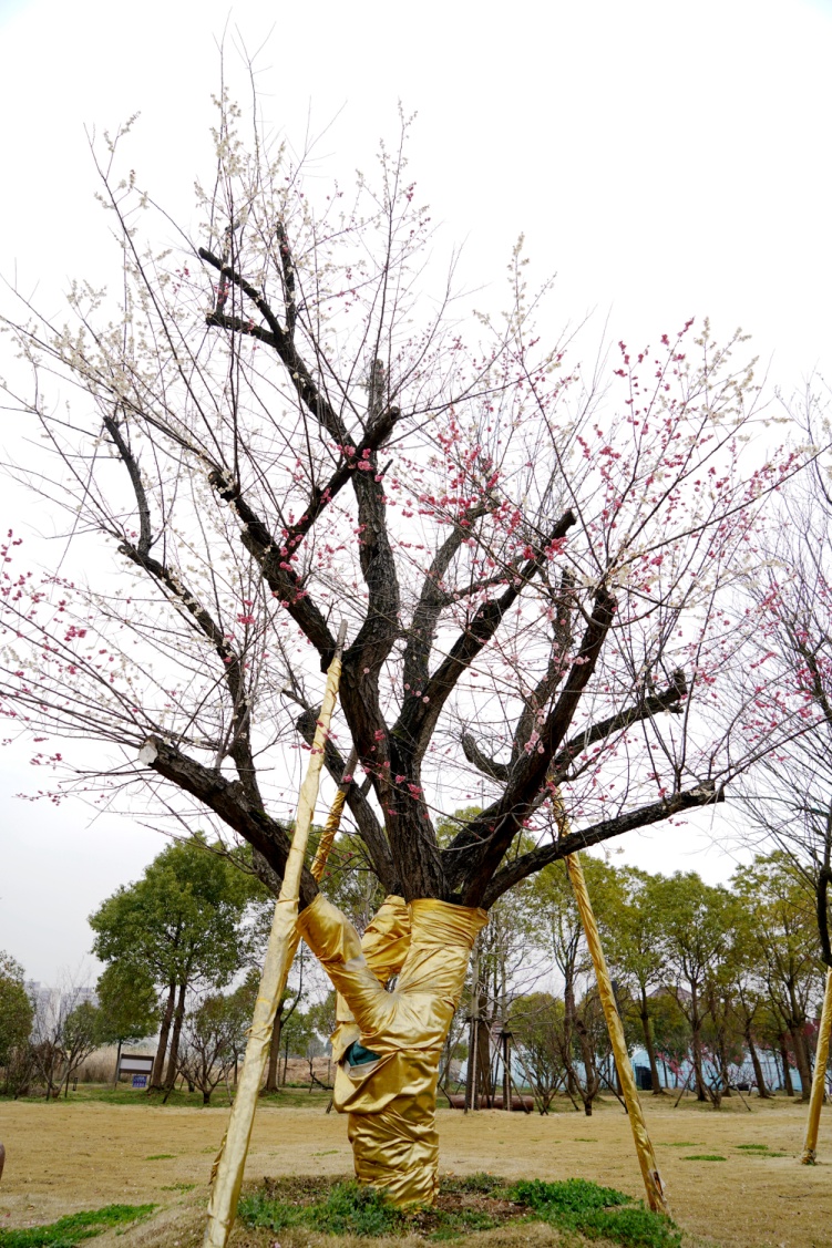 两棵树龄已有百年的红梅古桩位于草坪中央,格外吸引眼球。通过嫁接技术,枝头上呈现出粉白色梅花与玫红色梅花交错生长的景致。