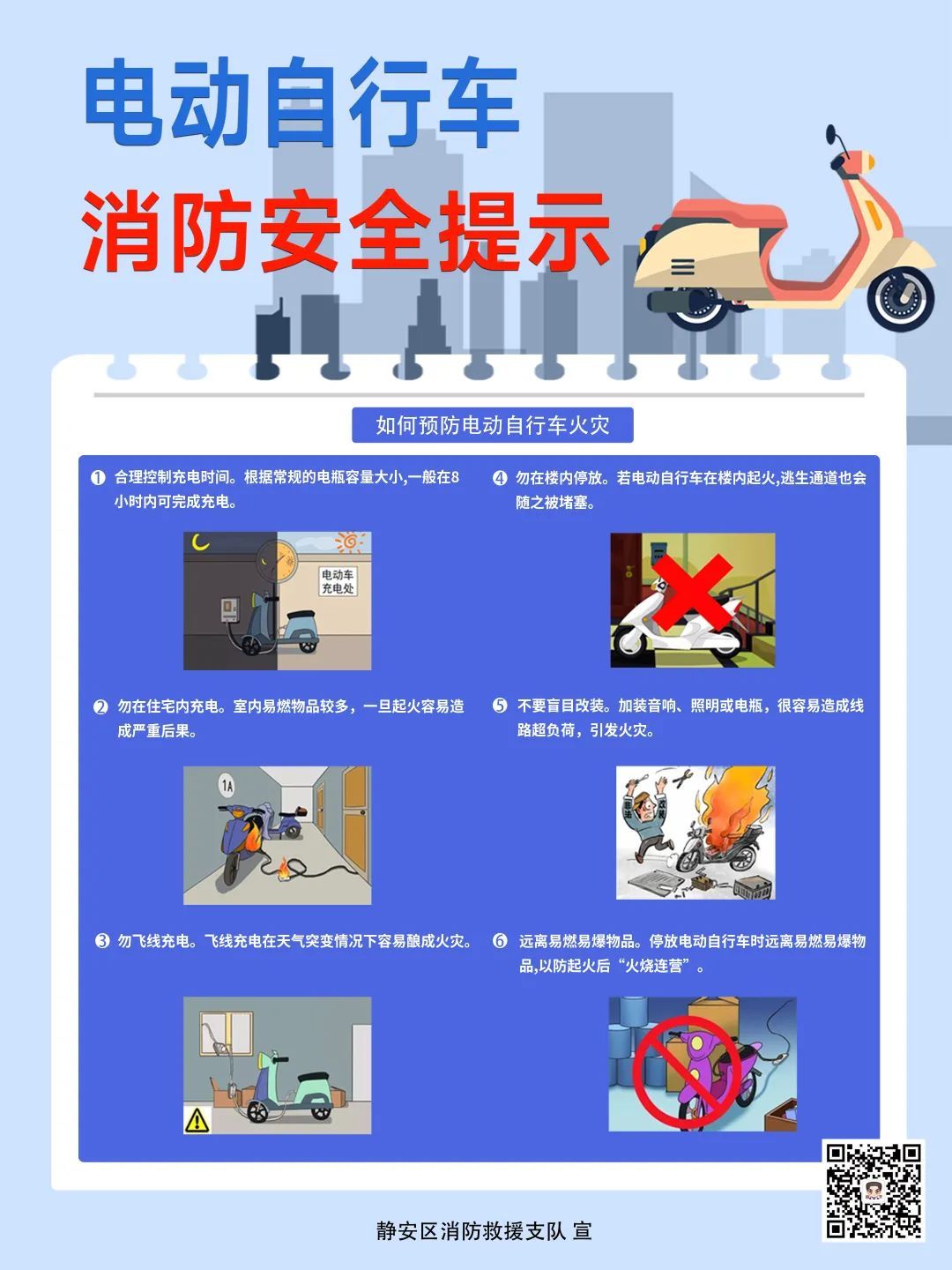 为了您和他人的安全,请不要将电动自行车停放在建筑物公用部位、疏散通道、安全出口以及人员密集场所的室内区域,更不要在这些区域给其充电。严禁入户充电、人车同屋、“飞线充电”;充电时应远离可燃物,充电时间不宜过长;不要擅自改装电动自行车,要定期检查车辆。