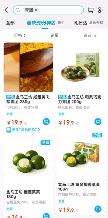 比如,盒马工坊有咸蛋黄肉松青团、和风巧克力青团、笋干菜青团等;叮咚买菜有槐花豆沙青团、腌笃鲜青团、红提乳酪青团等,可以满足不同人群的需求。