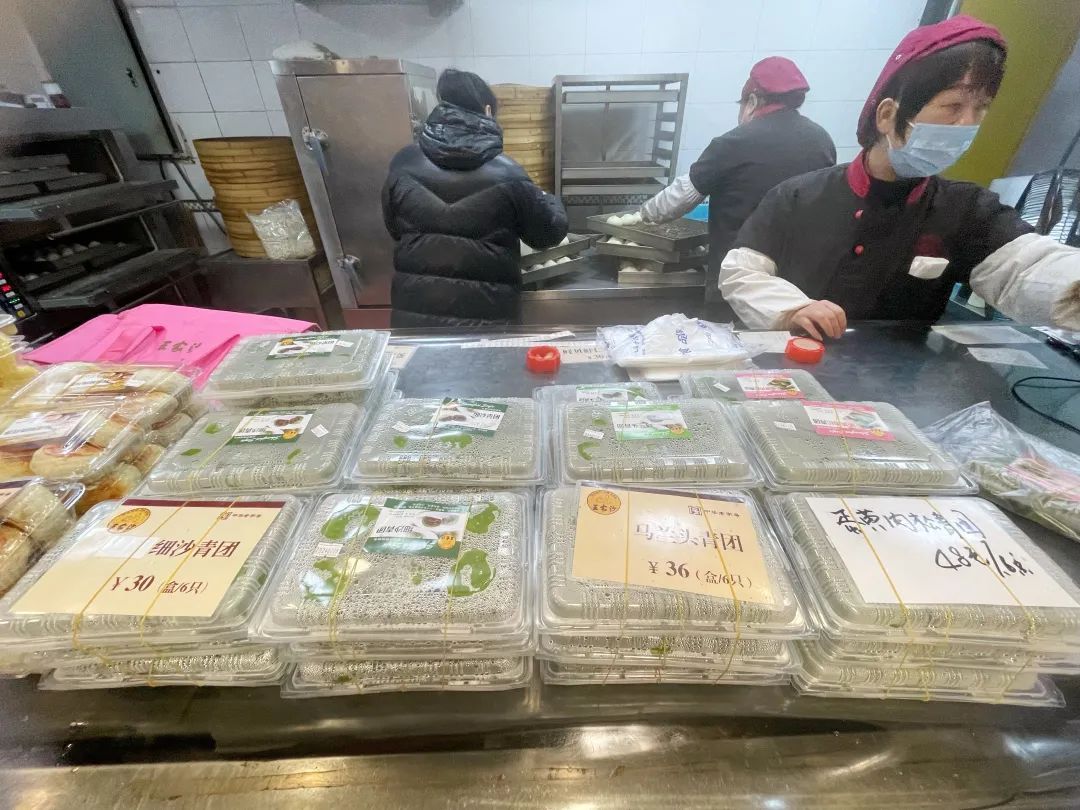 元宵节刚刚过去,很多朋友肚子里的汤团可能刚刚消化掉,又要迎来青团这位久违的“老朋友”。近日,沪上多家老字号的青团悄然上市,为市民的舌尖又带来了一款春天独有的味道。 早上9点, 虽然申城依然春寒料峭, 天空飘着蒙蒙细雨, 南京西路上的王家沙总店 却是人气满满, 不少上海爷叔、阿姨 正在排队买新出的青团。 透过橱窗玻璃,记者看到点心师傅们正在制作青团。而豆沙、蛋黄肉松、马兰头等三种口味的青团已摆上柜面开始销售。据工作人员介绍,元宵过后,店里就上新了青团,售卖会一直持续到6月。每一只青团都是现做的,非常新鲜,建议当天食用。 一位上海爷叔告诉记者,他每年都会来买王家沙的青团,今天他家孩子想吃青团,但是上班不方便来买,只能他们来。 排在旁边的阿姨一边手拿环保袋一边打电话:“1盒不够啊?那我买3盒好了,你分给大家一起吃。” 记者也买了一盒豆沙青团。一盒六个青团,每一个都颜色碧绿,拿在手里还是热乎乎的。趁热咬上一口,软糯的外皮、绵密的豆沙、清新的草香,满口都是春天的味道。 按照往年经验, 清明节前一周 才是青团销售最高峰。