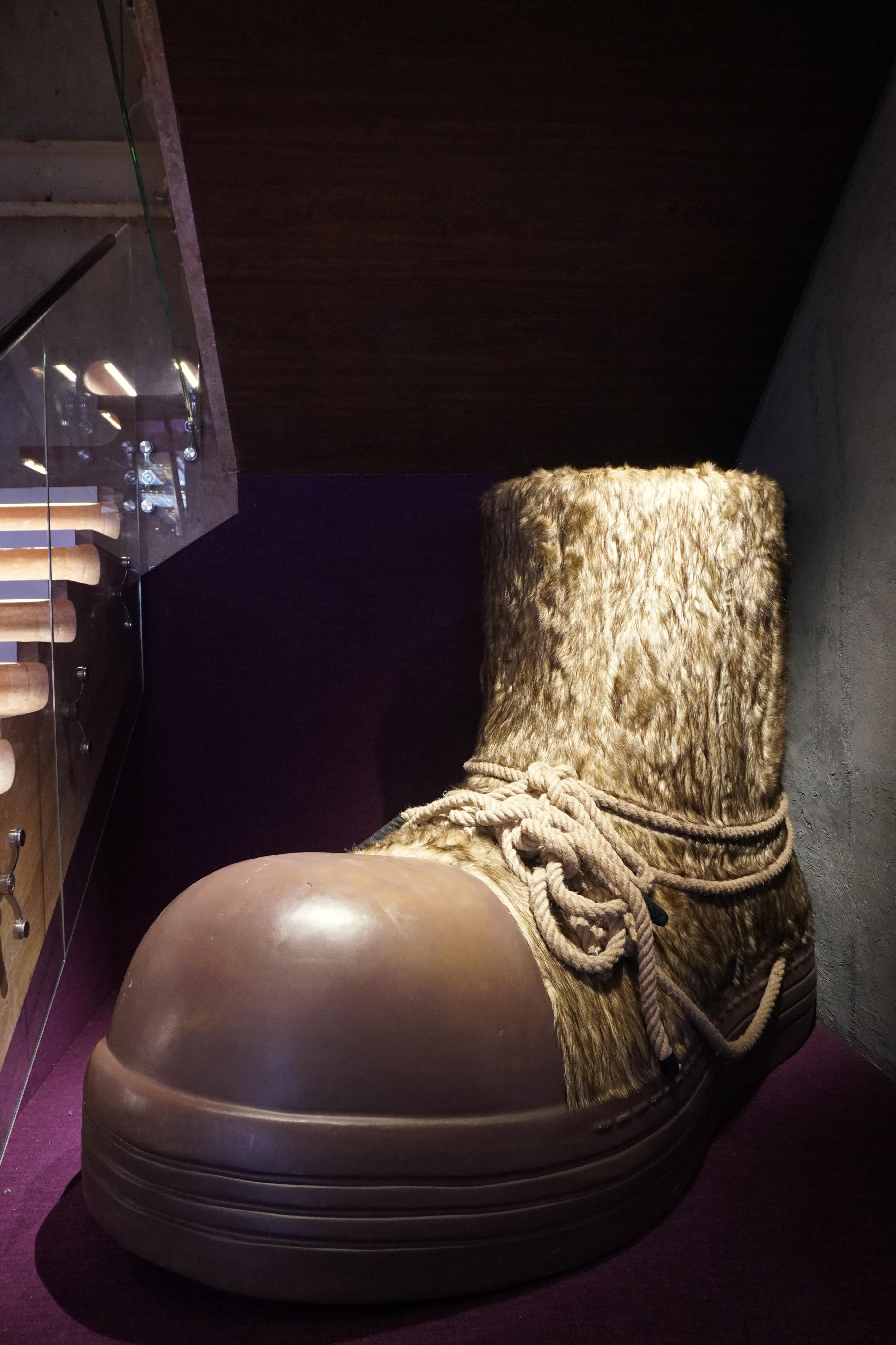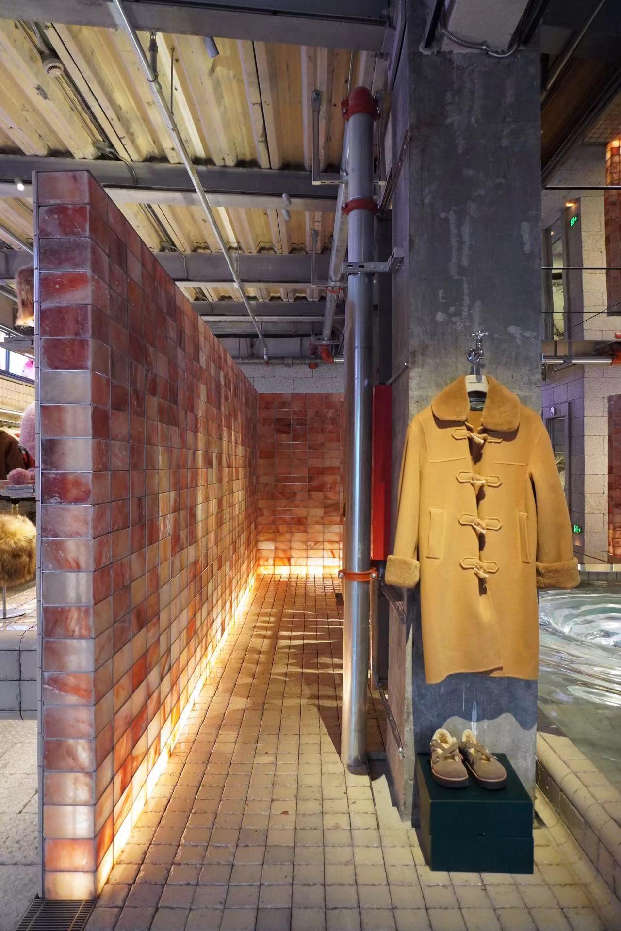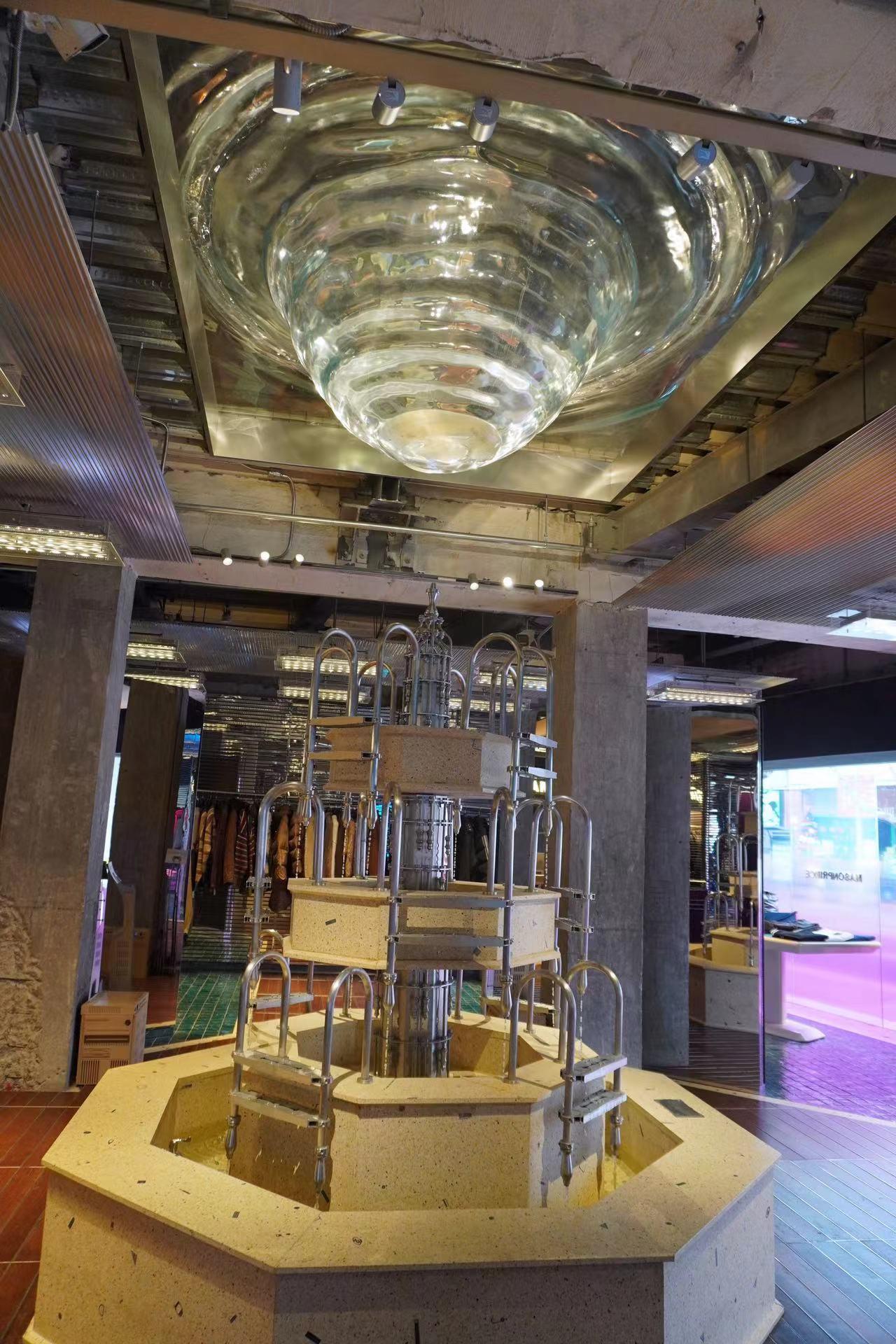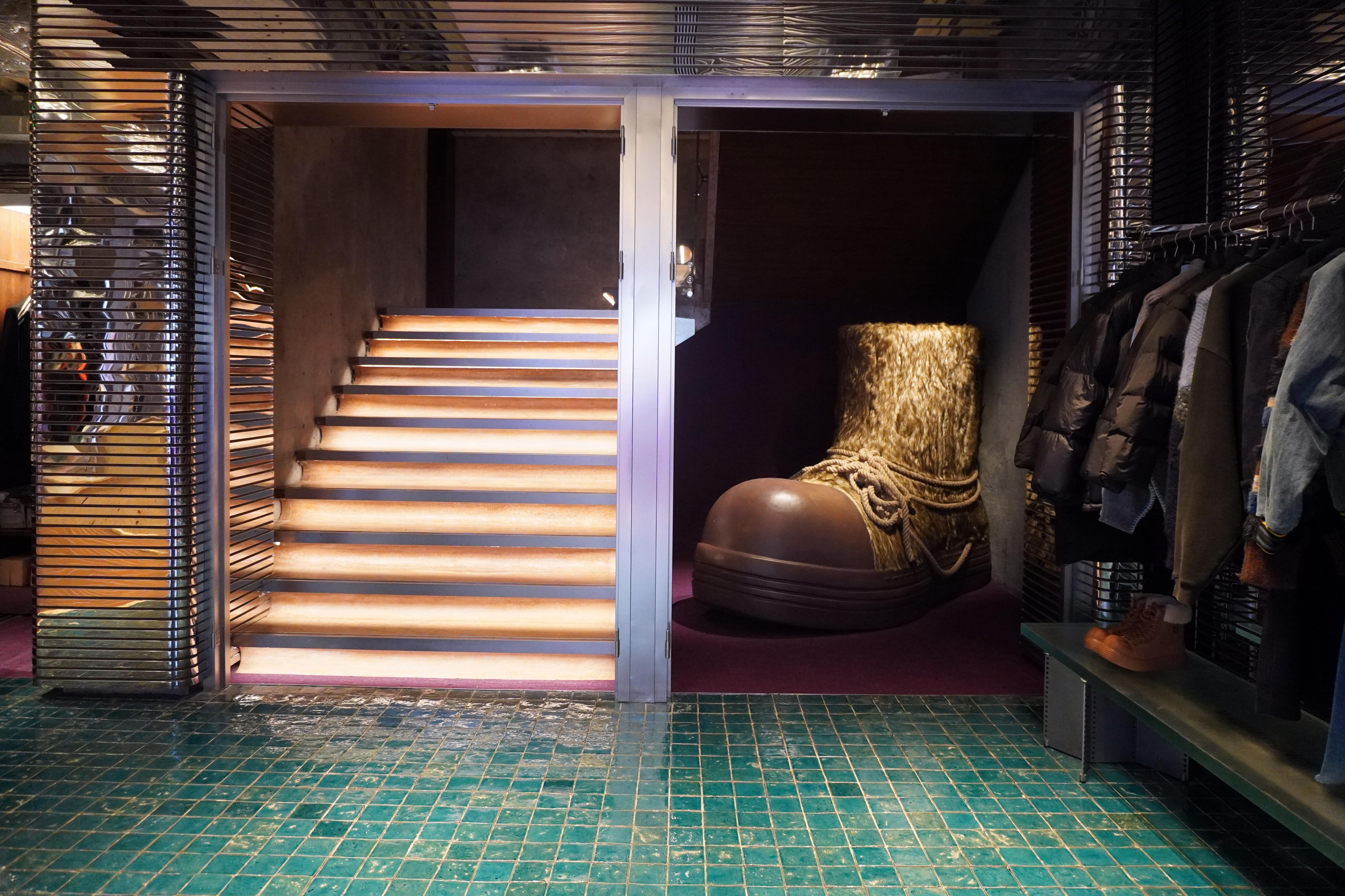 走进服装店一楼,正对着大门的是一座泳池喷泉,装置将泳池和喷泉元素重组,以未来复古为基调,通过反常规的组合方式和物理动态超越日常功能的限制,从而展现出一种全新的视觉和空间感知;而摆在角落里的一只硕大的雪地靴同样非常吸人眼球,与店内慵懒、摇滚、随意又复古的服饰风格非常吻合。