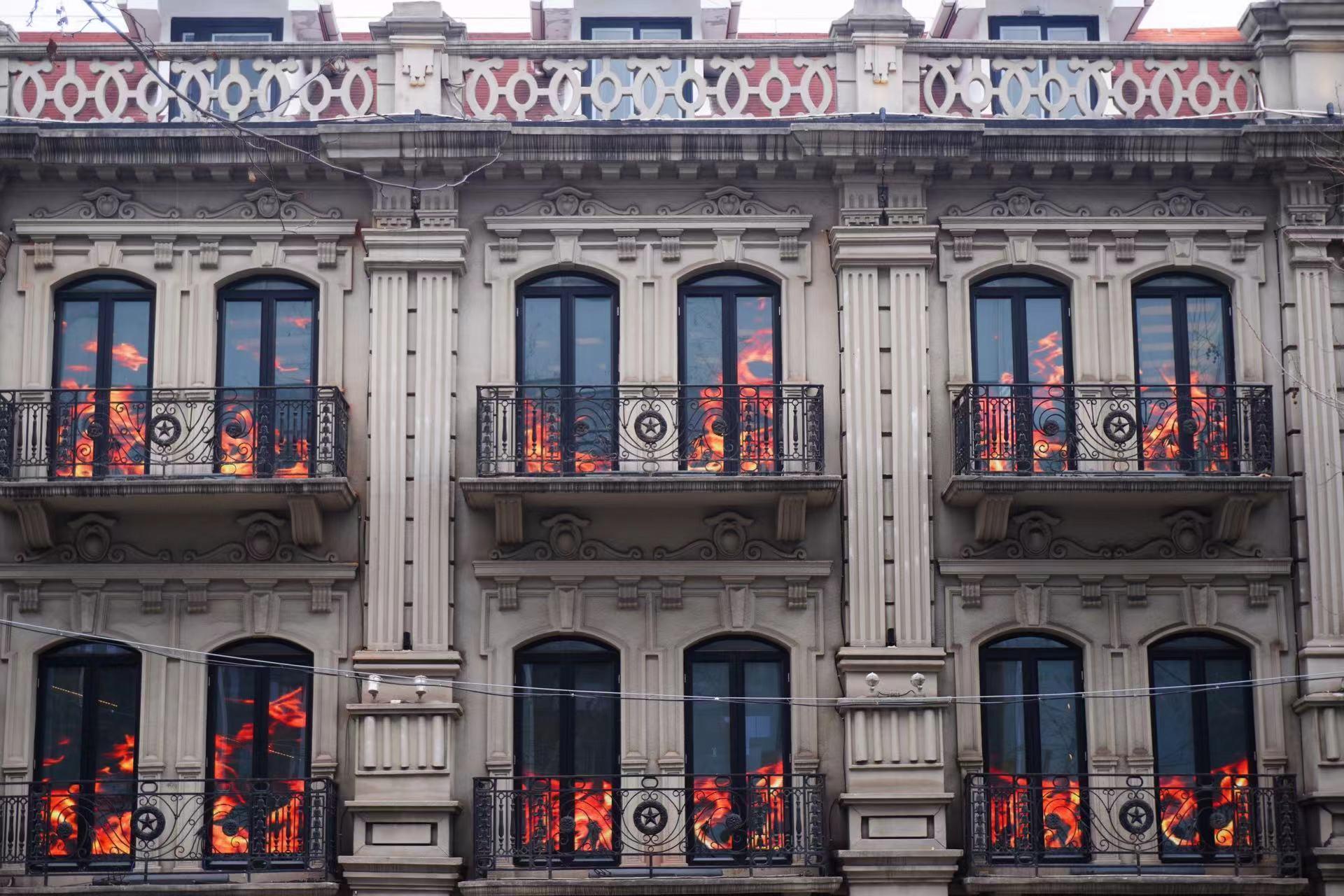 服装店位于淮海中路530号,透过巨大的落地玻璃可清晰看到,服装店的二楼、三楼内部都燃起了熊熊大火,金色的火苗越窜越高,火势凶猛到以假乱真,仿佛要吞噬掉整栋大楼。