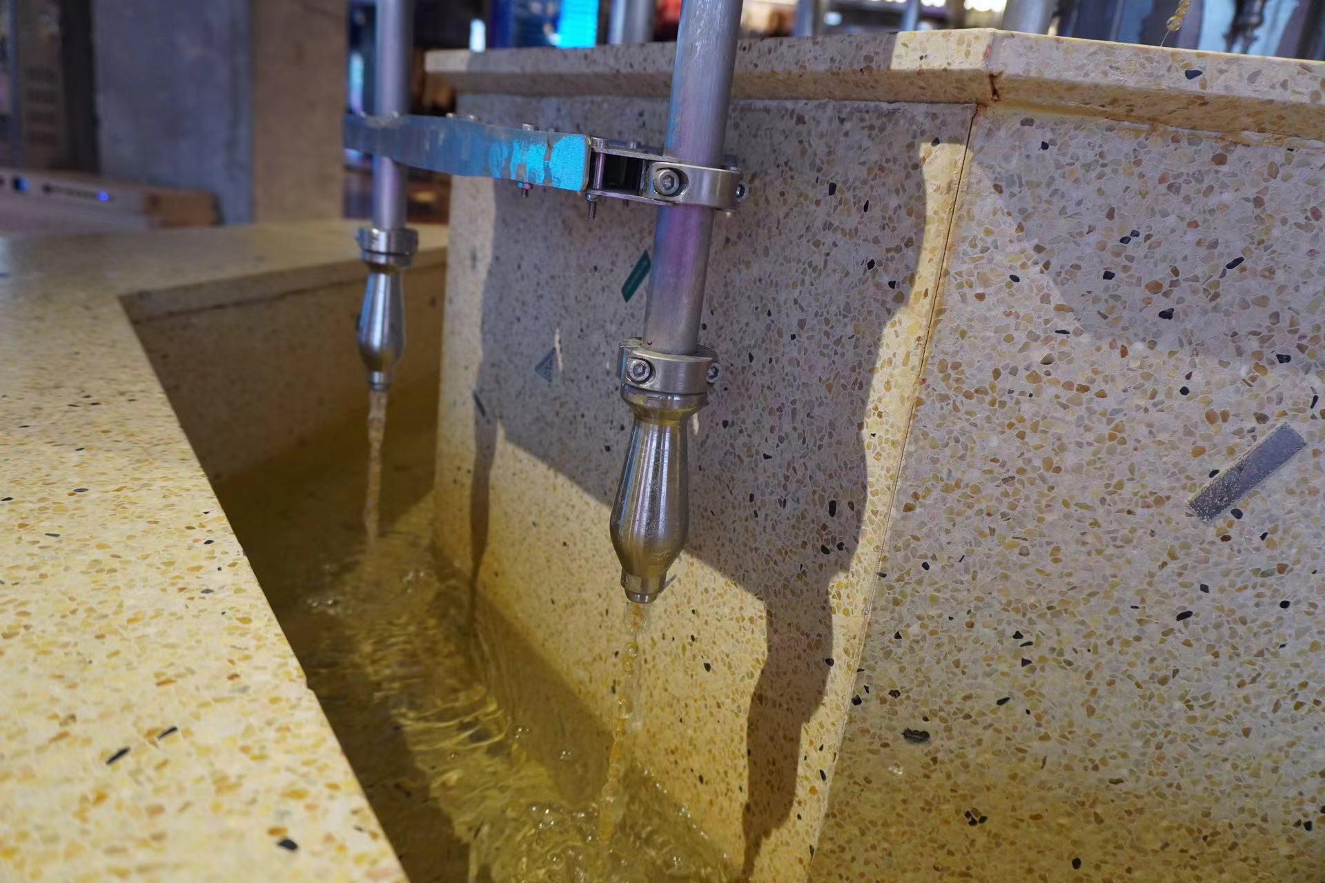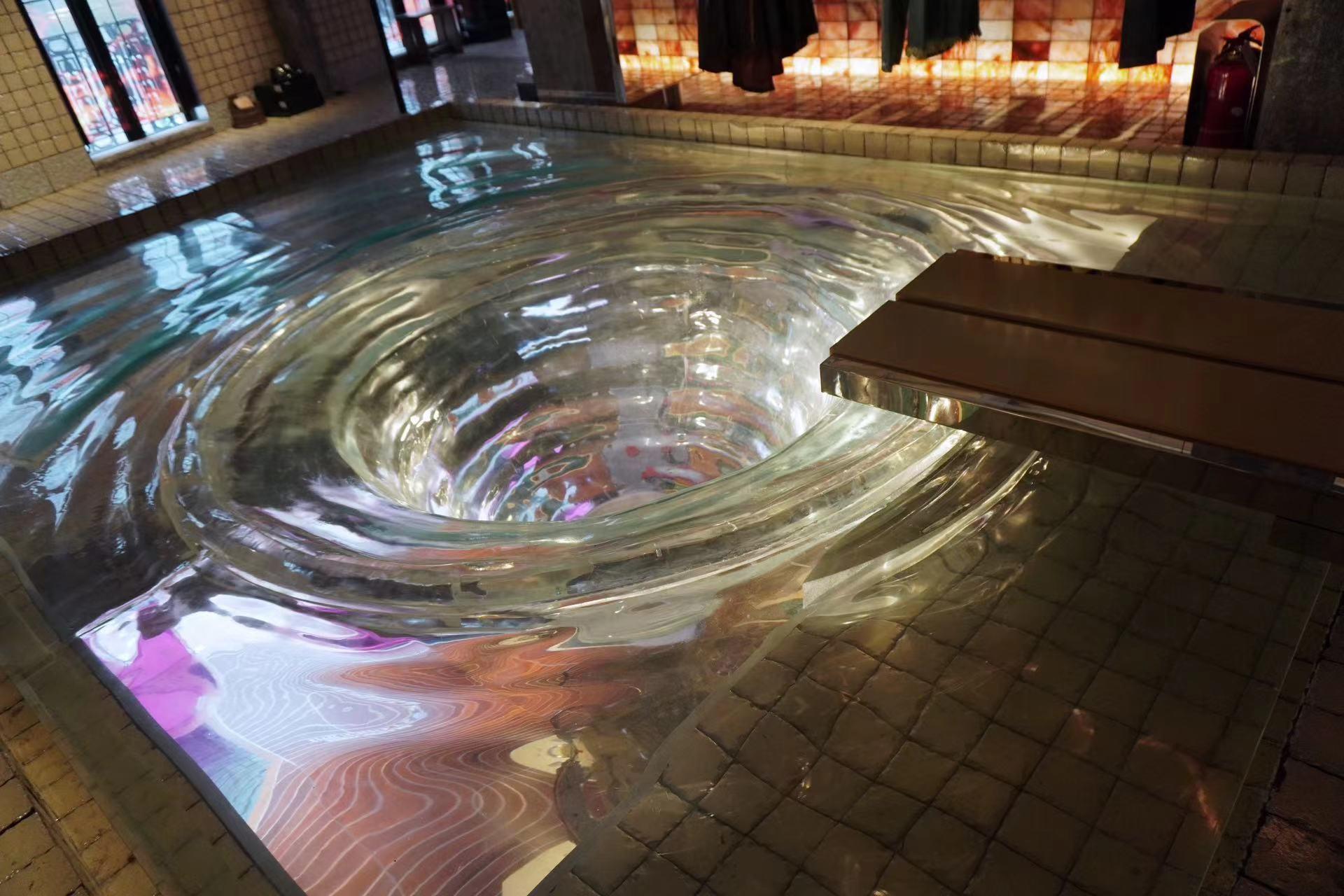 沿着楼梯拾级而上,二楼有一个艺术泳池装置,泳池清澈见底,而中央的超大漩涡,又给人一种暗流汹涌、深不可测的暗示。