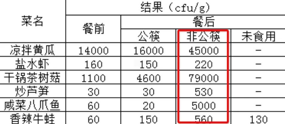 实验人员点了一桌菜,每道菜都有两份,一份用公筷夹取,另一份不用公筷。吃前、吃后分别进行采样,然后观察每道菜细菌污染情况。结果如下:
